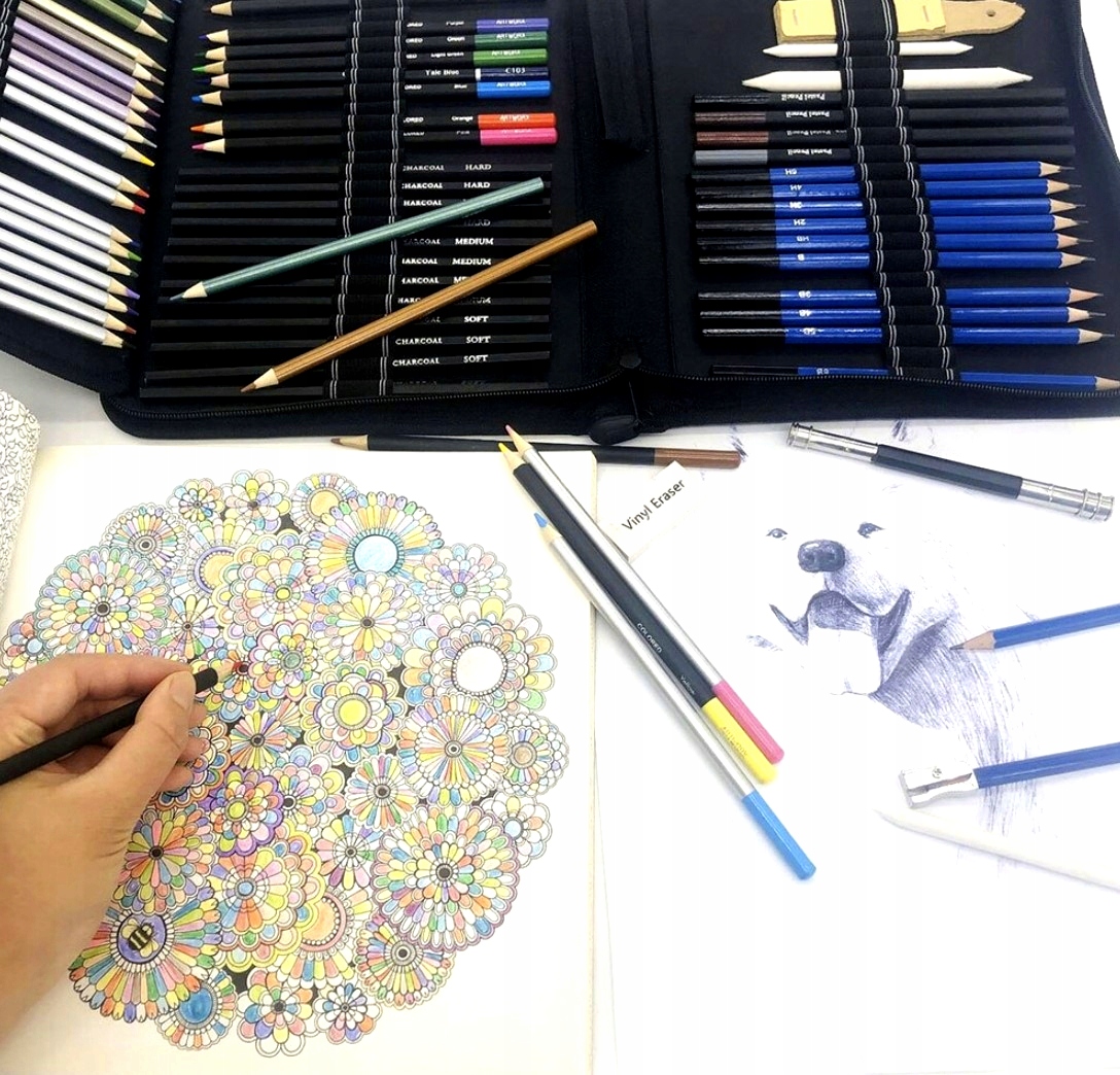 ✔️ Олівці та кольорові олівці хорошої якості - набір для малювання містить аж 12 професійних олівців різної твердості (від 2H до B8) і 12 кольорових олівців, 12 металевих, 12 водних і 4 пастельних, всі вони мають плавне ведення, хорошу пігментацію та м'якість графіту, що гарантує задовільну роботу як для швидкого ескіз і для точної ілюстрації