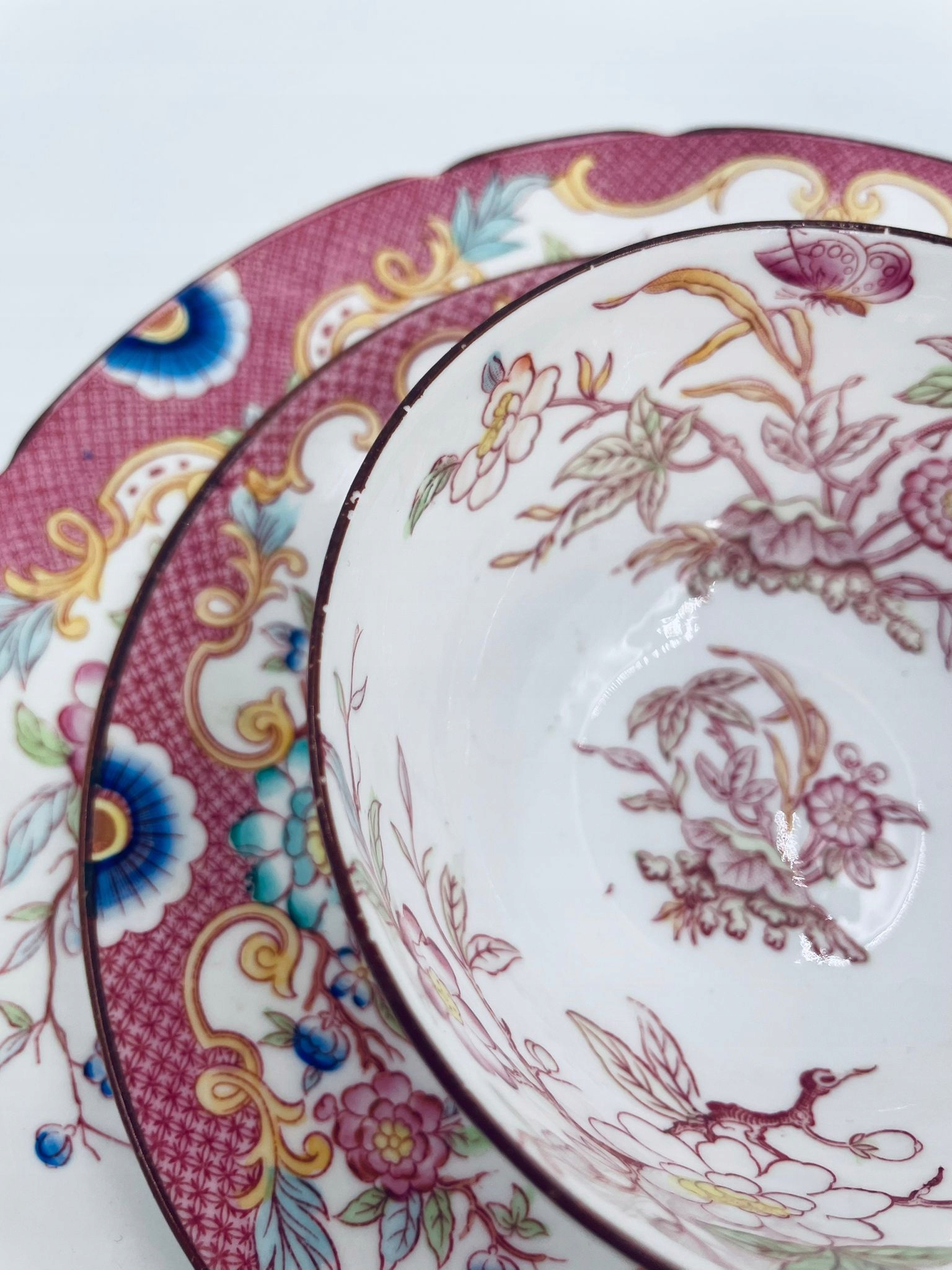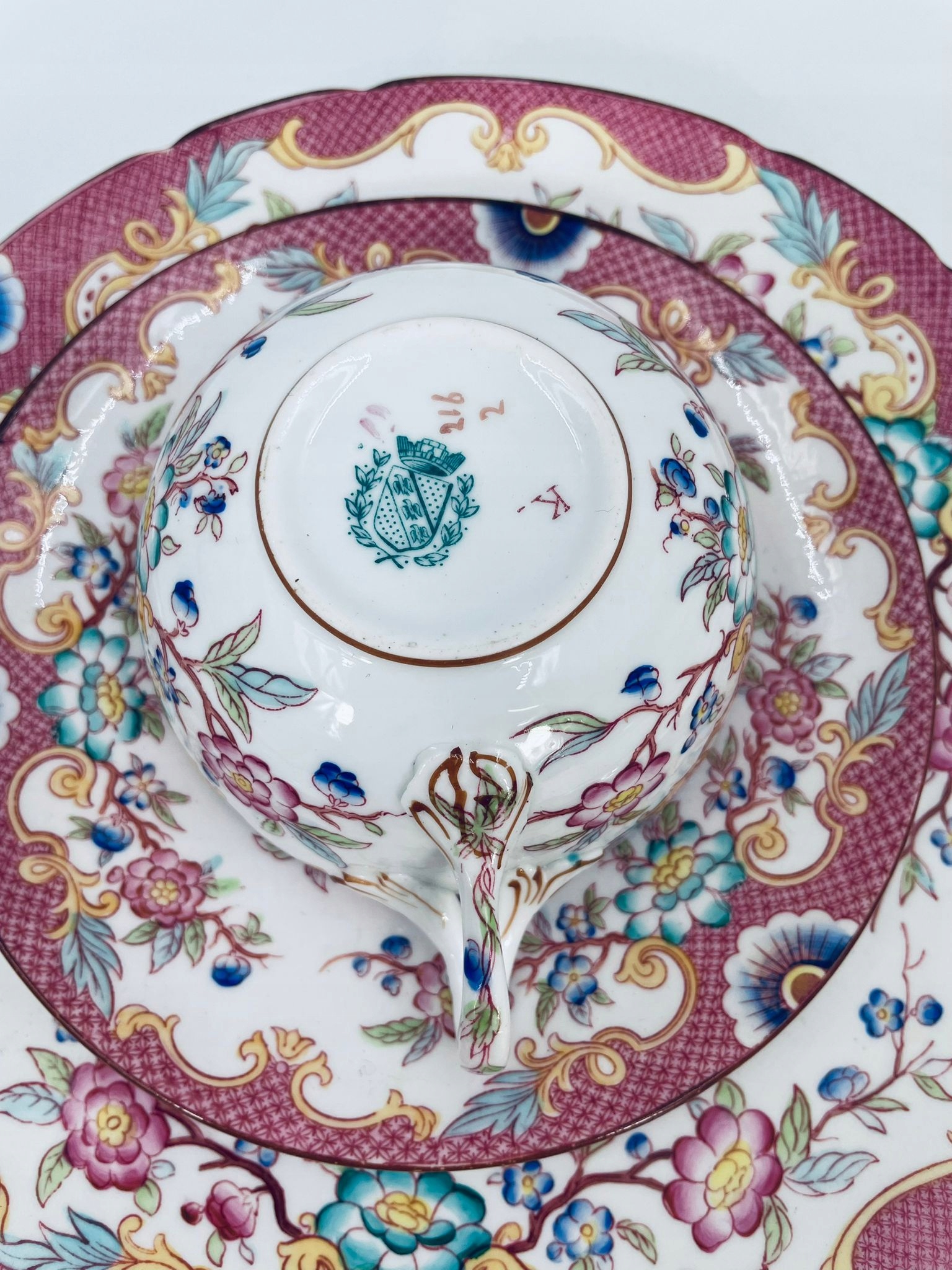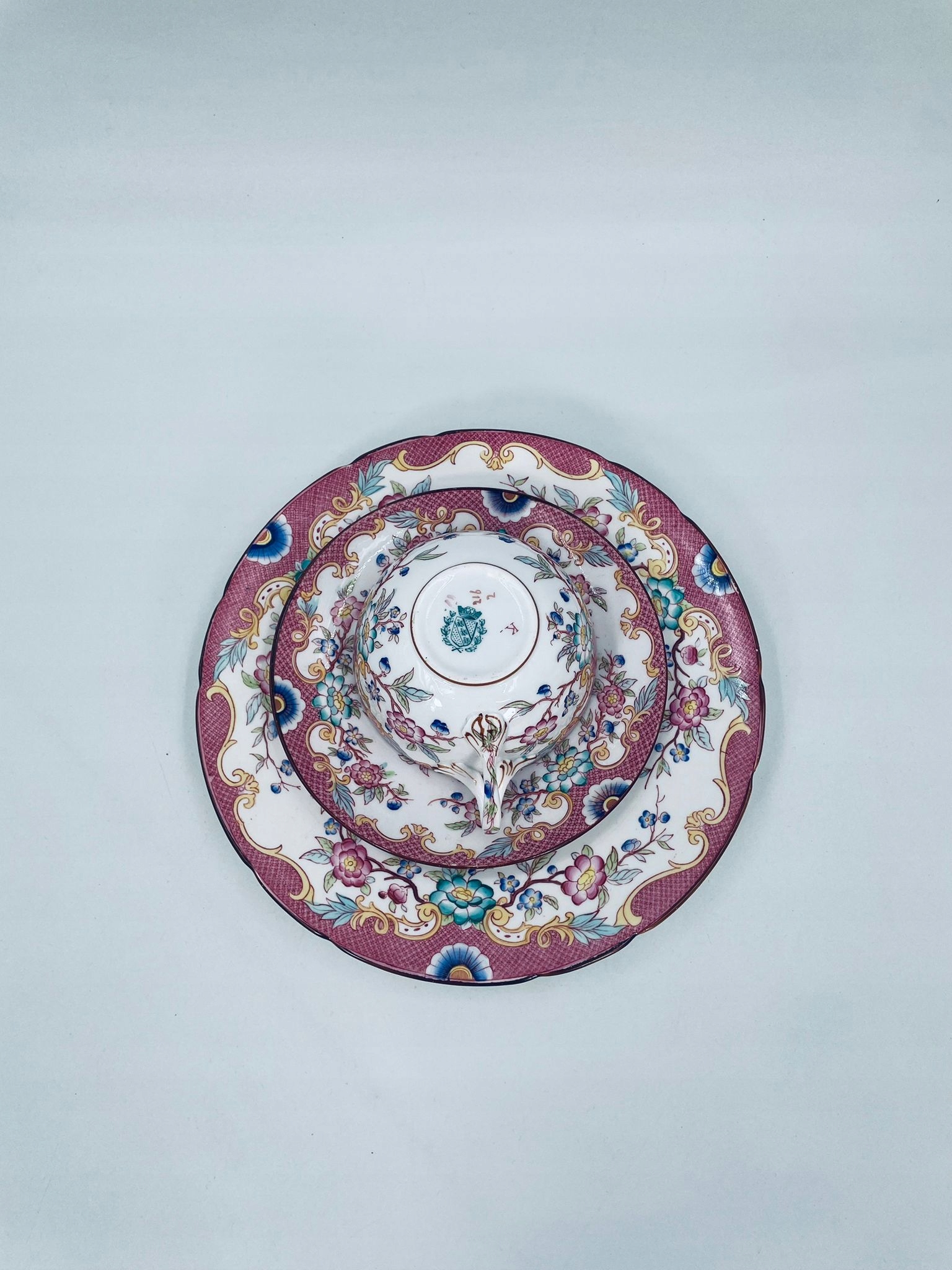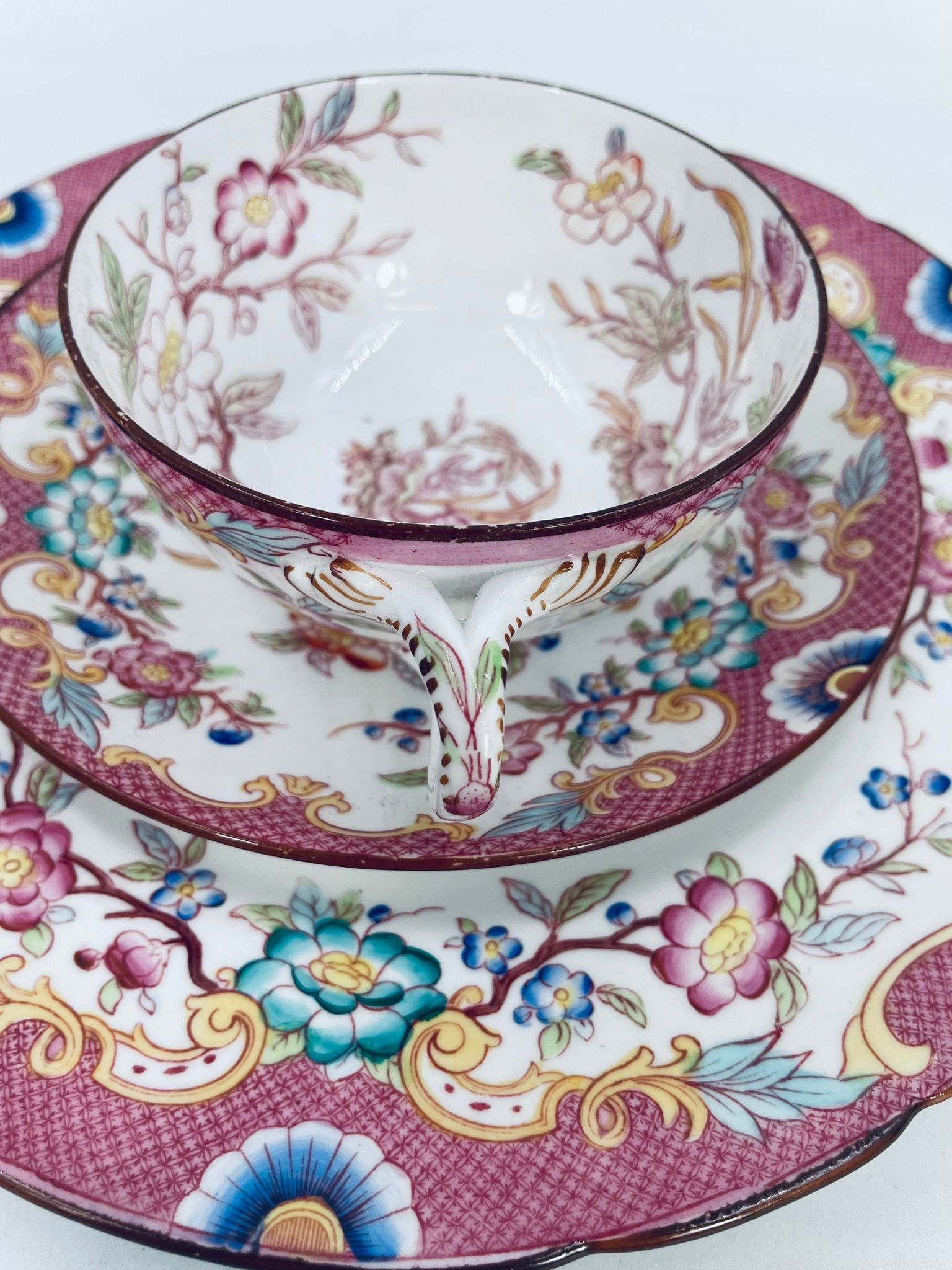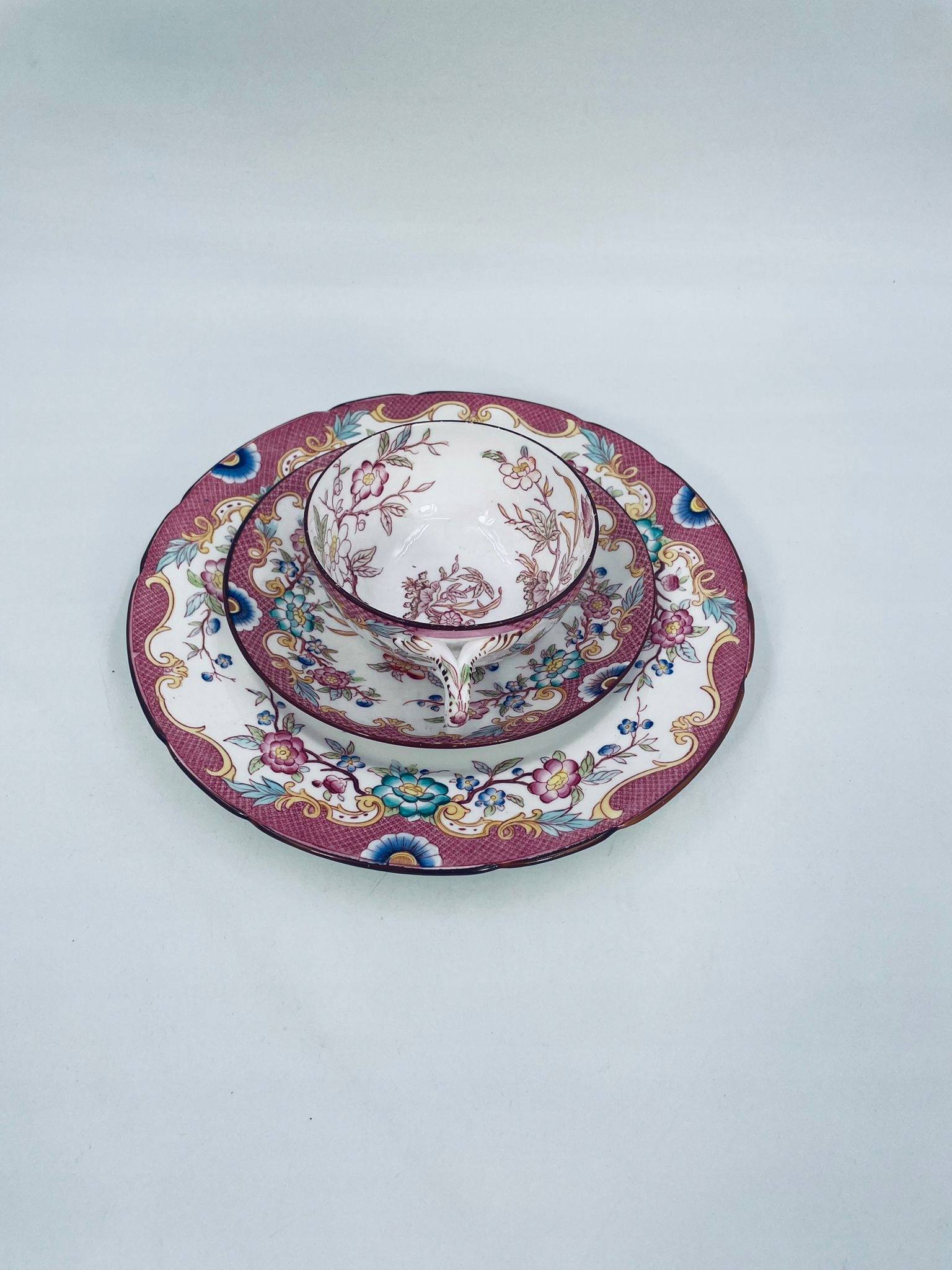Старовинний колекційний кубок у наборі трио від Sarreguemines 1860 року, виготовлений із найякіснішої білої глазурованої порцеляни. Набір характеризується ручним розписом рожевого відтінку в «японському» стилі зі східними мотивами Далекого Сходу, обробкою коричневого кольору по краях. Чашка має красиву, декоративну ручку і десертну тарілку з хвилястим краєм. Має невеликі потертості.
