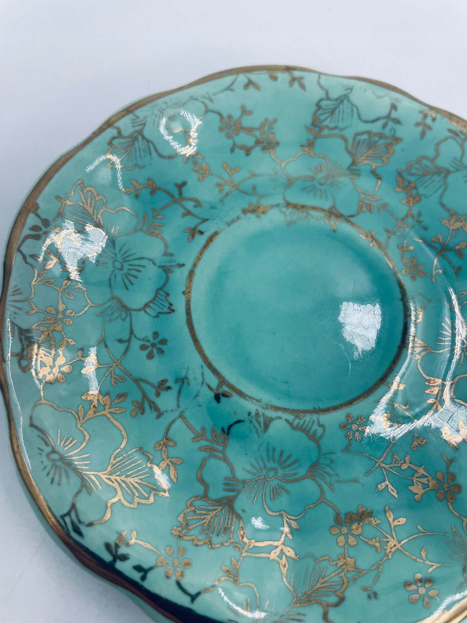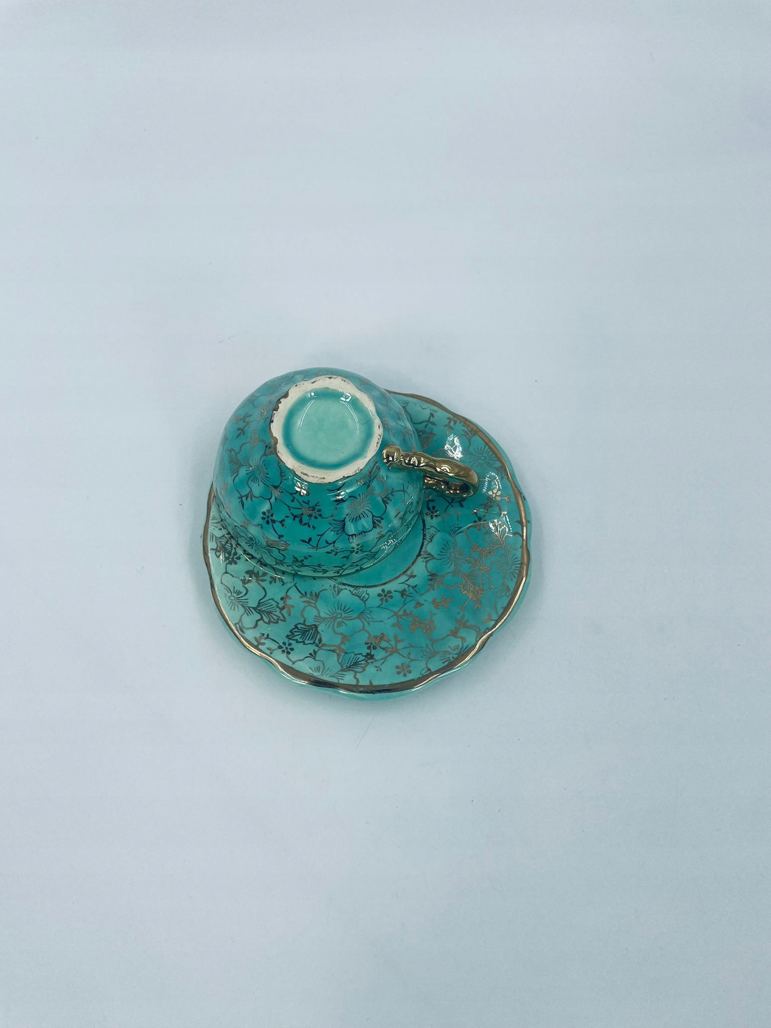 Колекційна чашка в дуетному наборі в стилі Vintage, виготовлена з високоякісної порцеляни. Набір пофарбований у бірюзовий колір, прикрашений багатими золотими вставками з квітковим мотивом, оздоблений золотою позолотою по краях. Має потертості на позолоті та невеликі пошкодження.