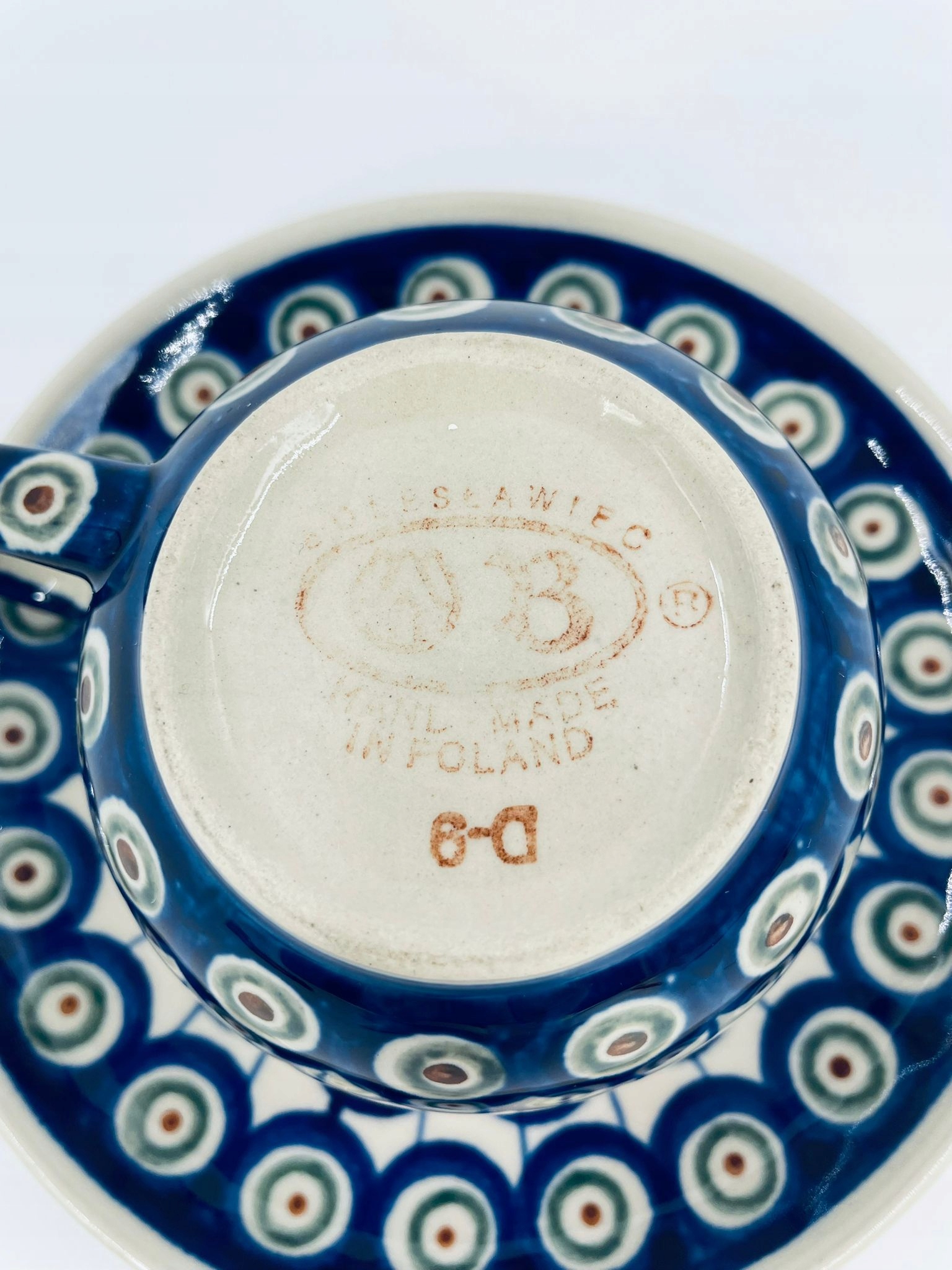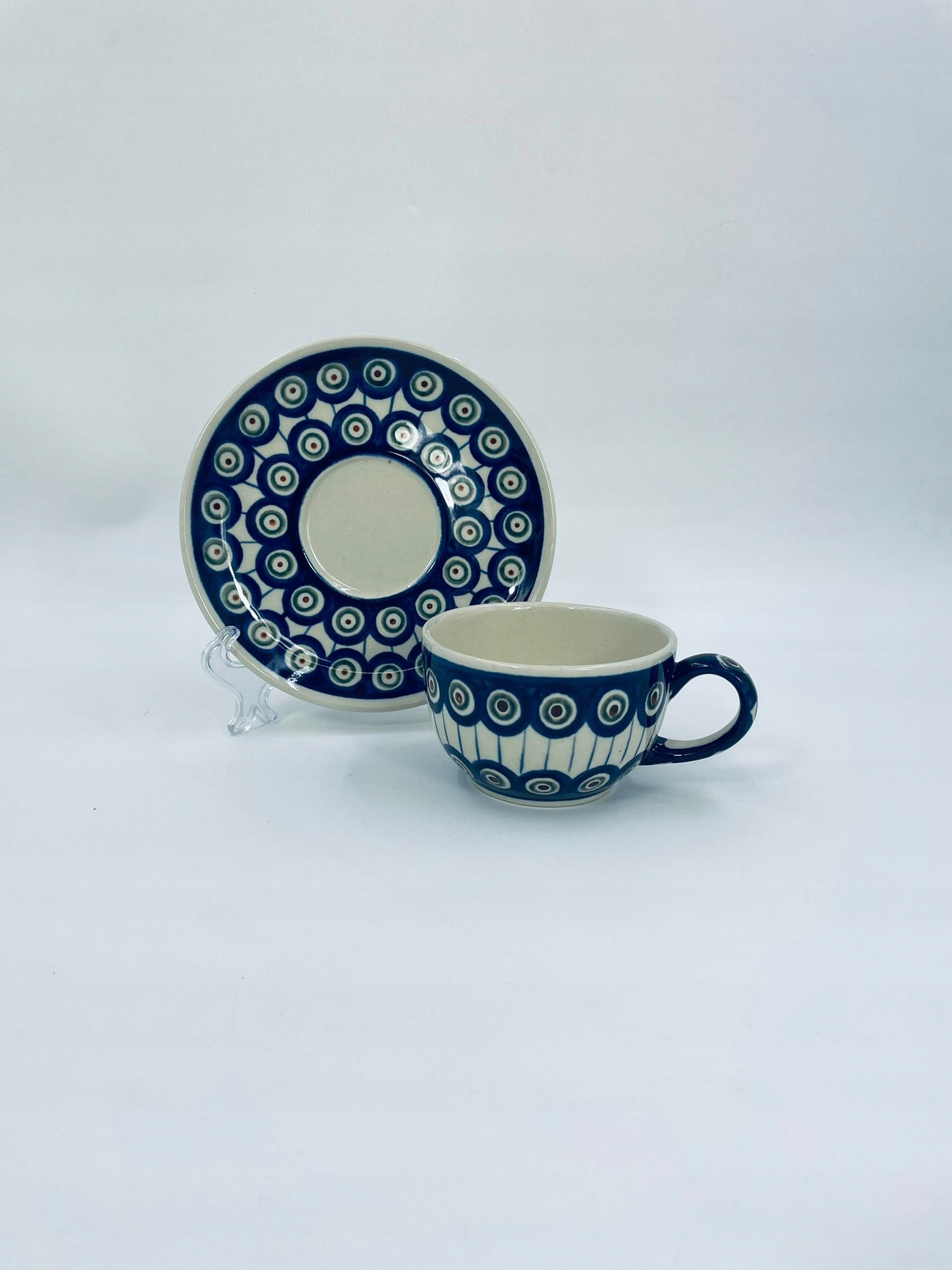 Колекційна чашка в наборі дует від польського виробника Bolesławiec, виготовлена з кераміки найвищої якості. Набір ручної роботи прикрашений традиційним візерунком павиного ока, розписаним вручну. Візерунки на болеславецькій кераміці нанесені штампами та пензликами. Має невеликі тріщини на емалі.