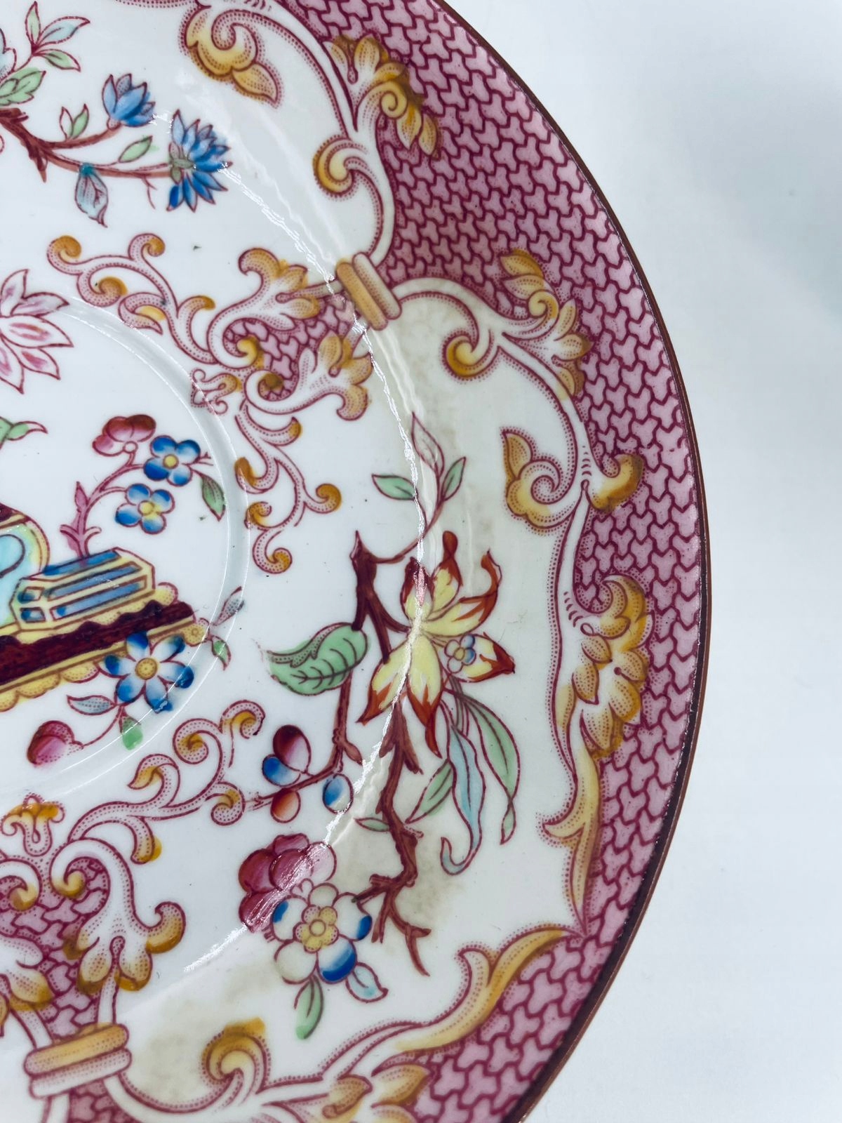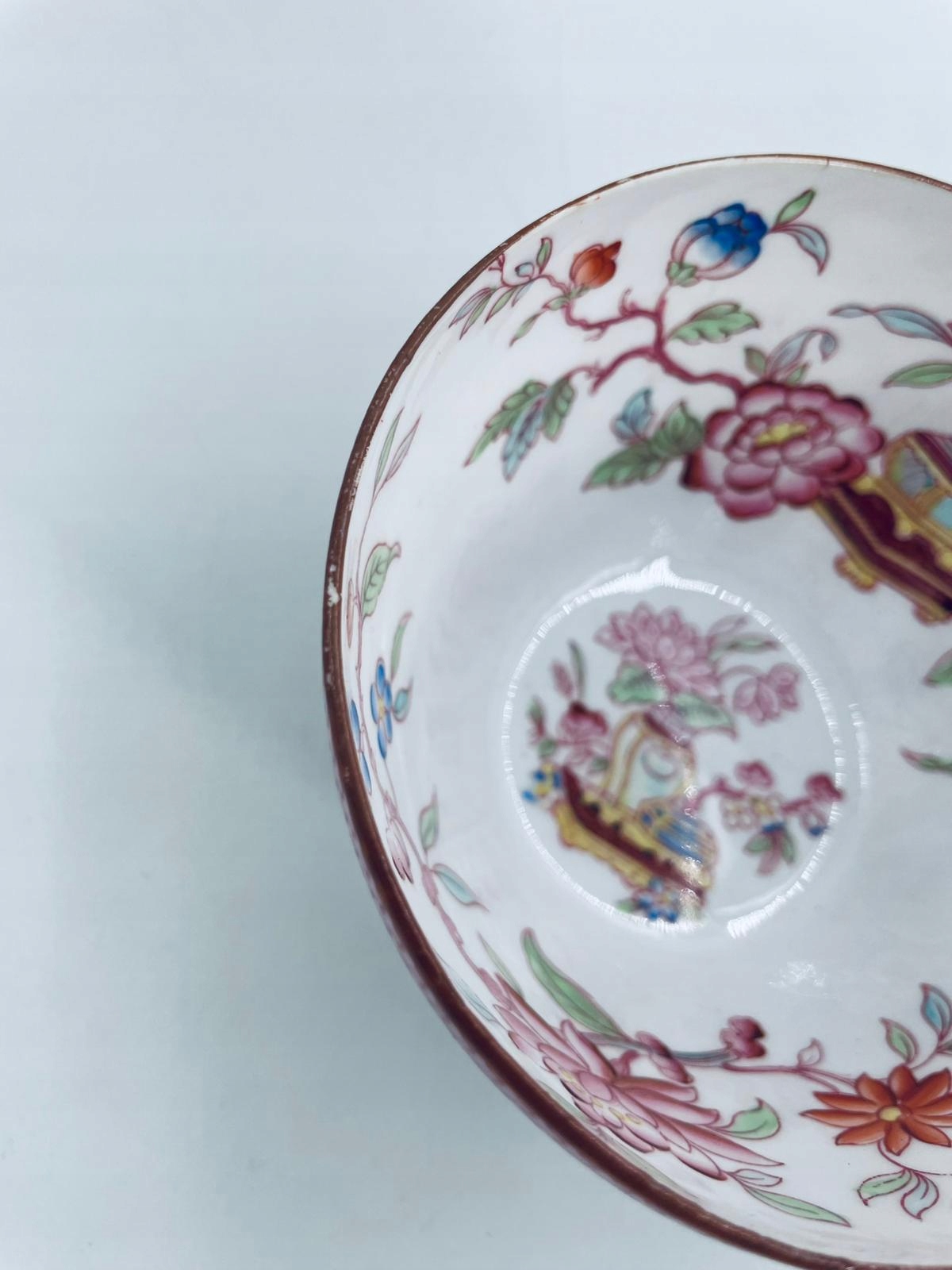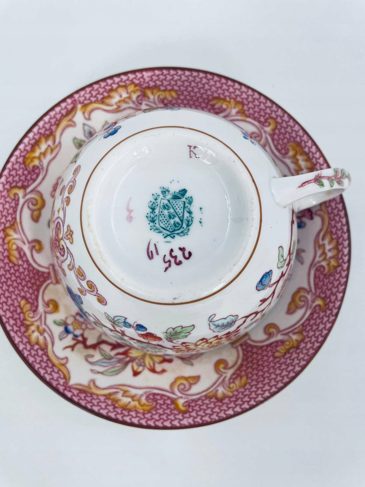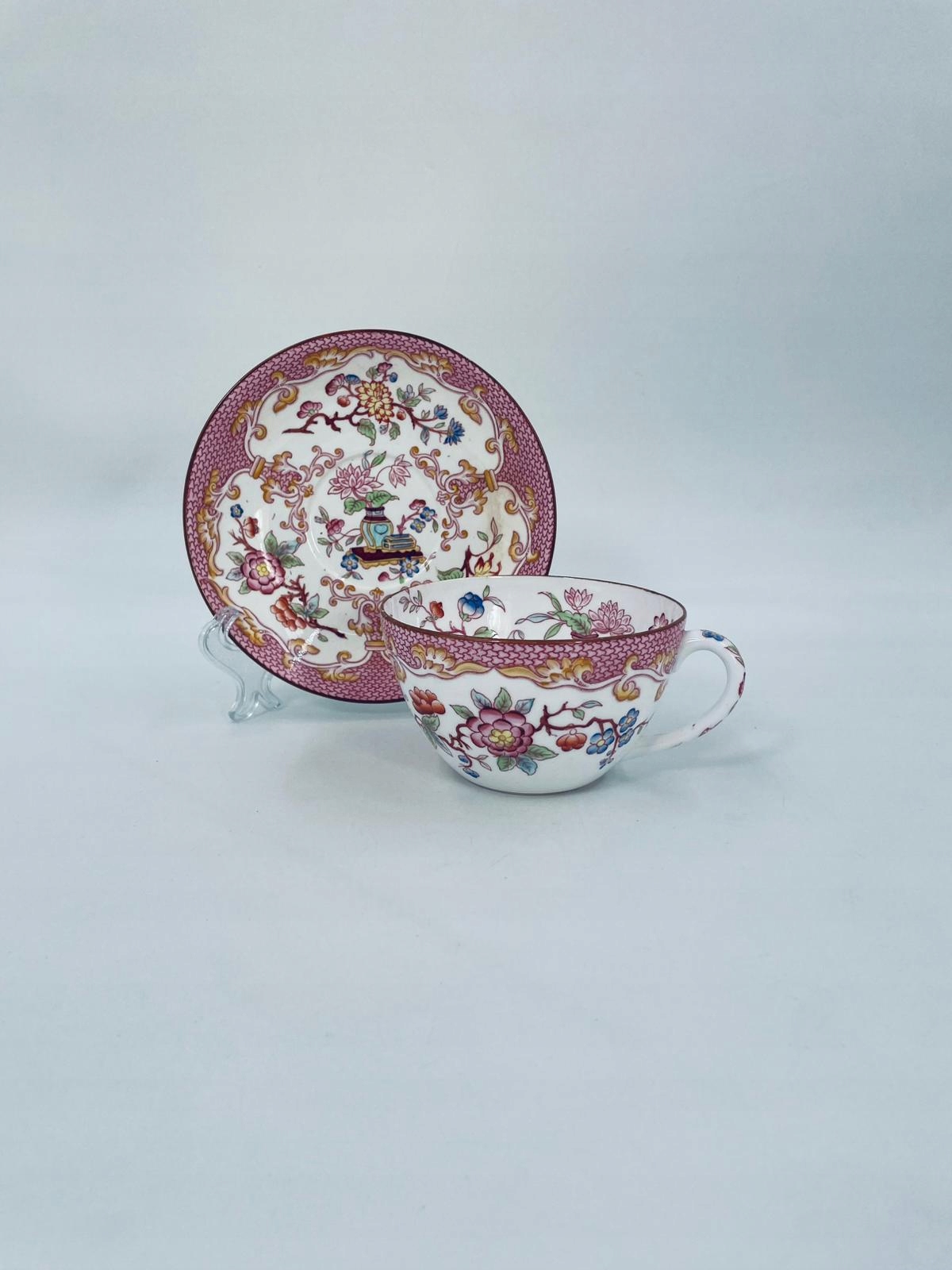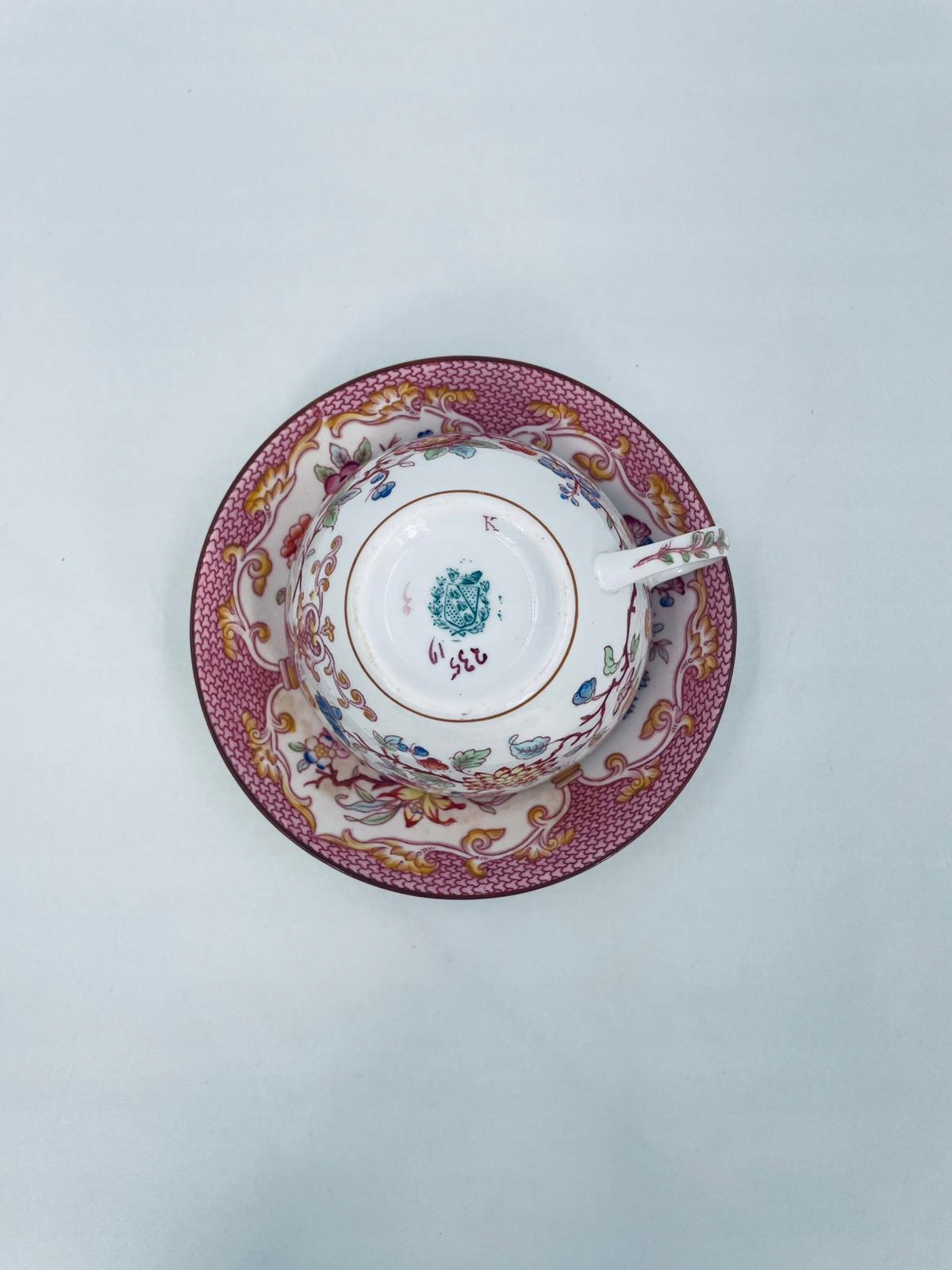 Антична колекційна чашка в комплекті, виготовлена компанією Sarreguemines Minton з 1860 року, виготовлена з найякіснішої білої глазурованої порцеляни. Набір характеризується ручним розписом рожевого відтінку в «японському» стилі зі східними мотивами Далекого Сходу, обробкою коричневого кольору по краях. Чашка має красиву, декоративну ручку. Він має невеликі потертості на краю та знебарвлення на блюдце.