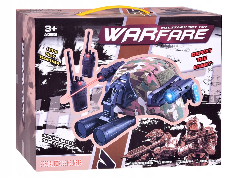 Шолом виготовлено з міцного пластику. Внутрішня частина обшита м'якою губкою, а зовнішня - камуфляжним матеріалом. Він оснащений регульованим ременем для підборіддя, що дозволяє легко підлаштувати його під голову дитини. Також шолом має елементи, до яких можна кріпити додаткові аксесуари: лампу, приціл з лампою і лазером, бінокль. Велику лампу можна встановити на шолом або будь-який елемент одягу (наприклад, в кишені), просто вставте її. Червоні та сині світлодіоди забезпечують постійне, переривчасте або тривожне світло - лампа має три режими освітлення. Також на шолом можна встановити два приціли - з тонким червоним лазерним променем і звичайний ліхтар. Ефекти освітлення виглядають неймовірно реалістично, особливо в затемнених кімнатах! Прицільні пристосування встановлені на «рейку», тому їх легко пересувати і обертати. На лоб шолома ми можемо встановити бінокль, який можна опускати і піднімати. Бінокль дійсно наближає вас, і ви також можете регулювати їх відстань. Окуляри доповнять одне ціле, щоб дитина відчула себе професійним військовим. Рації живляться від батарейок і справді працюють! Під час гри ви можете спілкуватися з друзями, щоб визначити стратегію та оточити ворога :)