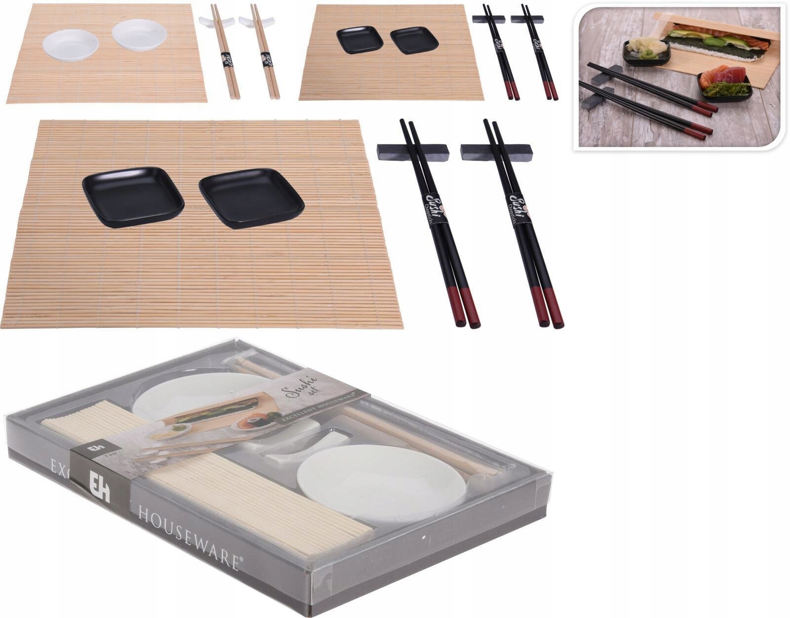 - ✅ Складається з двох наборів бамбукових паличок, двох підставок для паличок, двох миски для соєвого соусу та один бамбуковий килимок