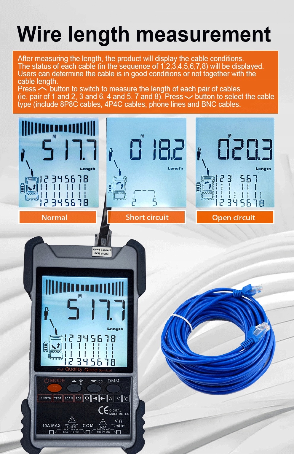 Цей лічильник поєднує функції відстеження кабелю та вимірювання його довжини. Перевагою цього лічильника є велика дистанція відстеження, чіткі звукові сигнали, швидке і точне вимірювання довжини кабелю. Лічильник є практичним інструментом для лабораторій, фабрик, монтажників мереж поліцейських автомобілів і техніків. Він може вимірювати довжину мережевого кабелю, коротке замикання та розрив у реальному часі. Функція відстеження кабелю може швидко й ефективно знайти цільовий кабель у великій кількості кабелів. Цю функцію можна використовувати в телефонних системах, комп’ютерних мережах, кабелях BNC та інших металевих мережевих кабелях.