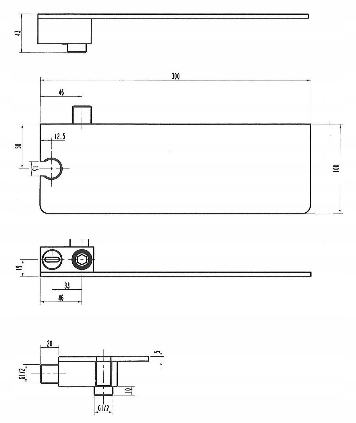 два виходи змішаної води, два входи: для гарячої та холодної води