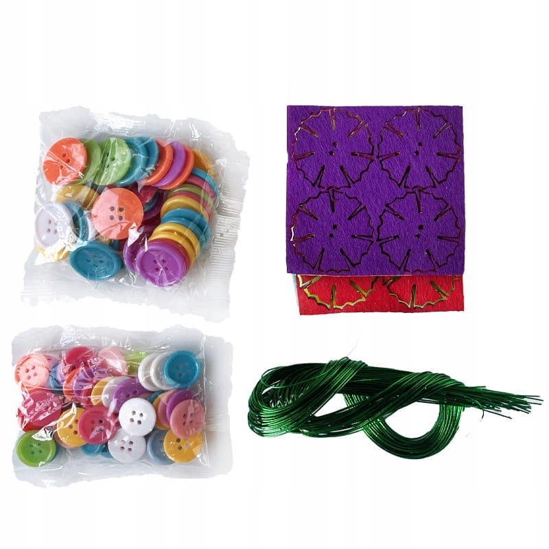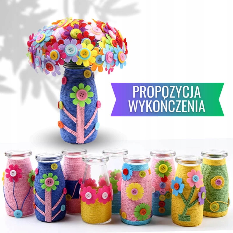 - кількість елементів: 1 шт - пляшка, 28 шт - фетрові елементи, дроти, ґудзики, 1 шт - двосторонній скотч, 1 набір - кольорові шнурки (два кольори приблизно по 12 м кожна), 2 шт - зелена рослина, мереживо, блискуча намистина, стрічка