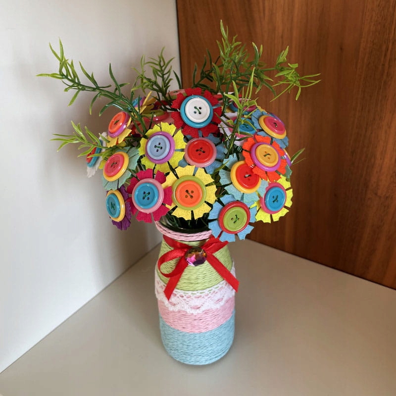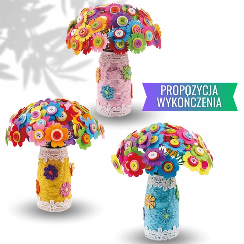В набір входять вирізані фетрові елементи, гудзики, зелені дроти для виготовлення квіти і скляна пляшка, спеціальний двосторонній скотч для її обклеювання, кольорові шнурки для одягання на пляшку. У набір входять дві зелені гілки для наповнення букета, стрічка для бантика на пляшці, мереживо та блискуча намистина для кріплення.