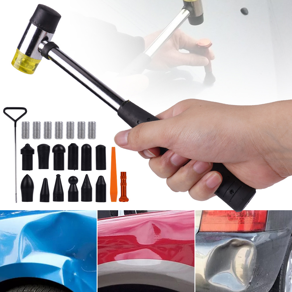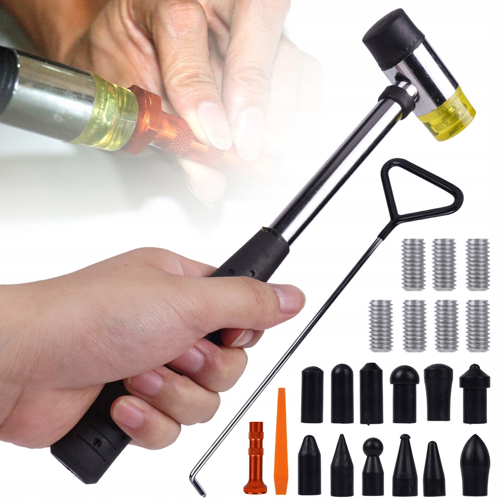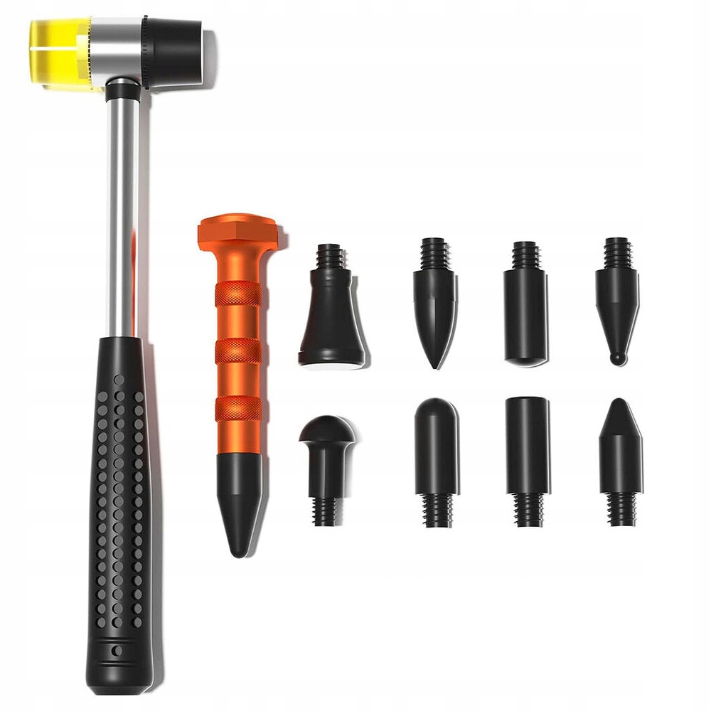 Чорна головка молотка виготовлена з високоякісної сталі з високою твердістю, яку нелегко зламати та міцна. Оснащений 12 різними формами наконечників, ви можете вибрати потрібну залежно від розміру вм’ятини чи вигину.