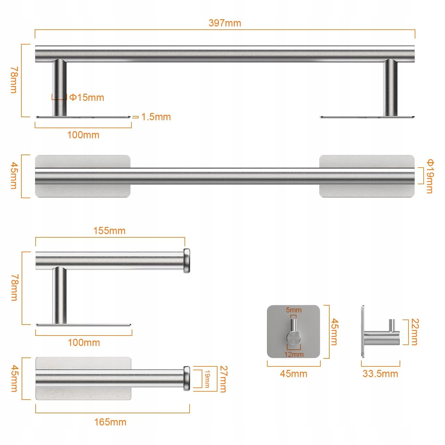 ✔ У наборі 5 практичних елементів - 1 вішалка для рушників, 1 тримач для туалетного паперу та 3 універсальні гачки. Усе, що вам потрібно у ванній кімнаті!