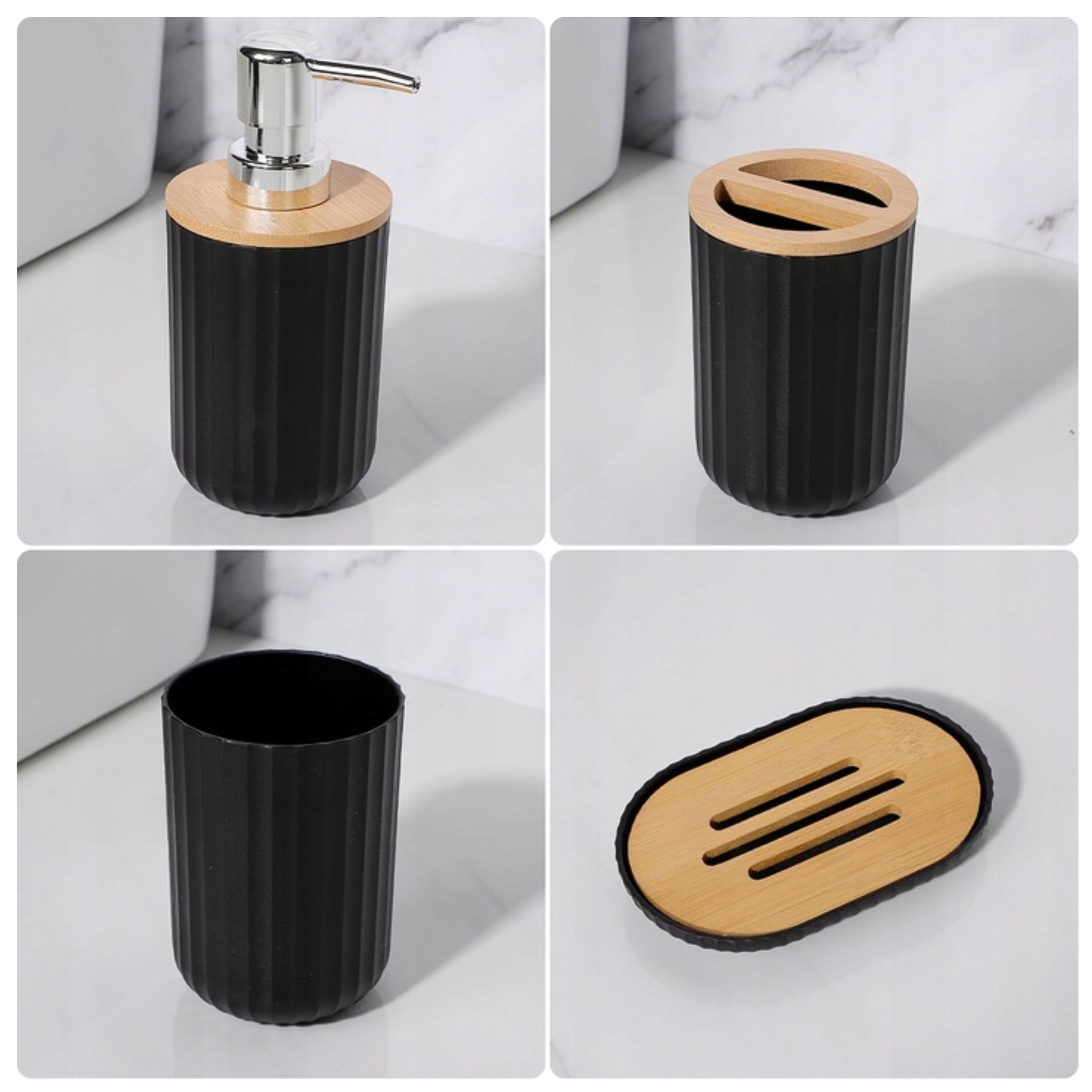 Набір із 6 аксесуарів для ванної кімнати, виготовлений з високоякісного PP матеріалу з бамбуковою фурнітурою, є ідеальним поєднанням функціональності та елегантності. Чорний колір і рифлена зовнішня поверхня аксесуари надають інтер'єру сучасний характерзабезпечуючи при цьому комфорт і гігієну використання.