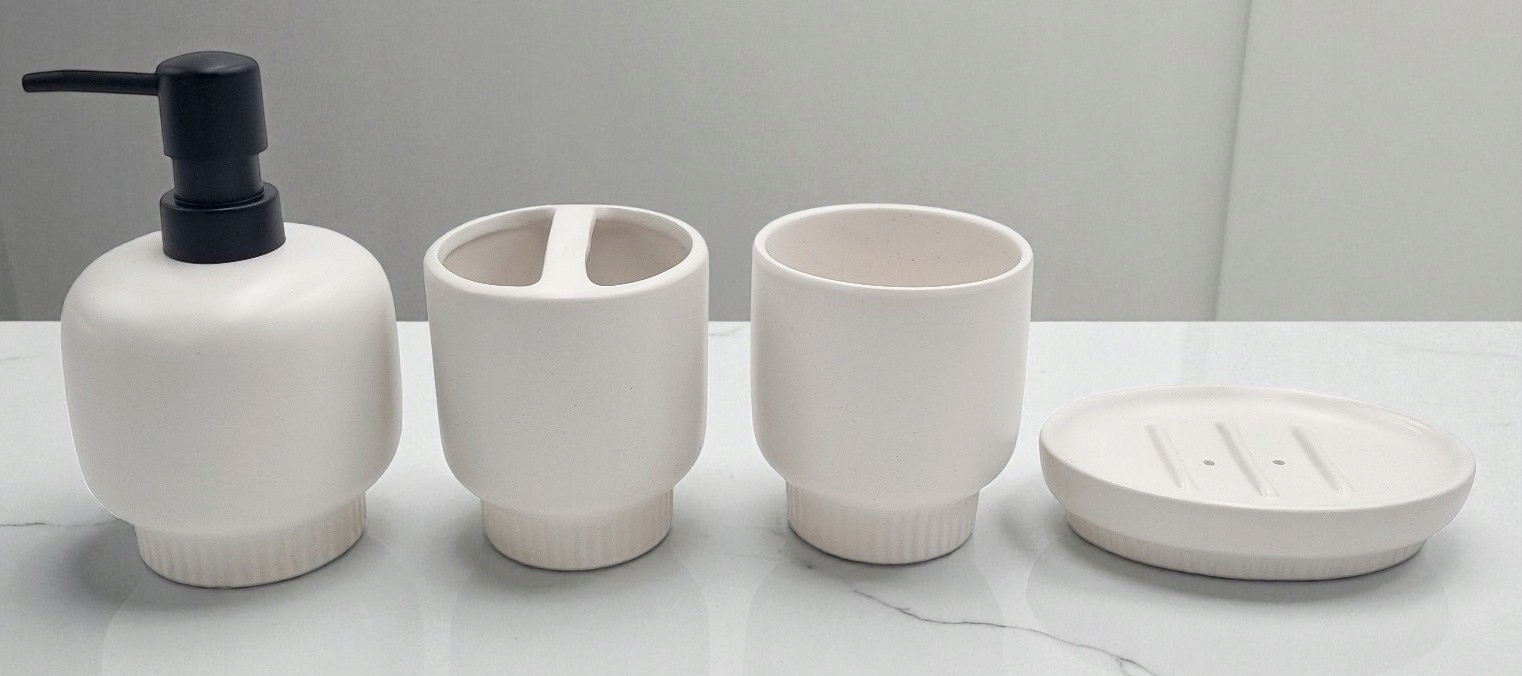Набір складається з дозатора рідкого мила, класичної мильниці для мила, кухля та контейнера для зубної щітки. У контейнері для щіток є окремі отвори, які допомагають підтримувати їх у чистоті. Чашка ідеально підходить для зберігання зубної пасти або бритви.