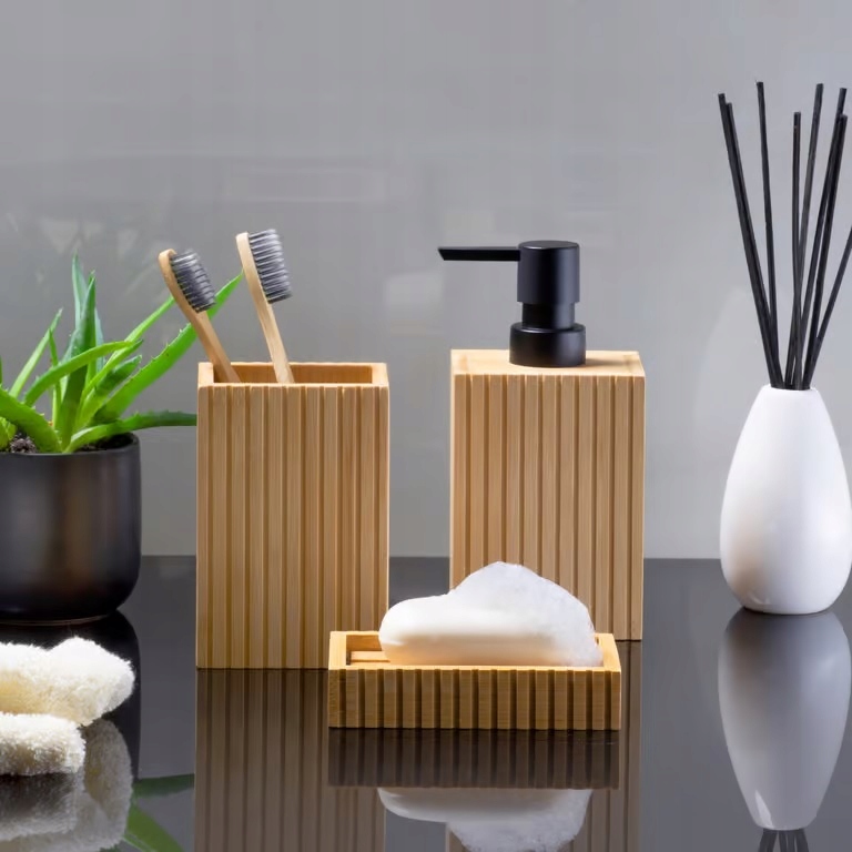 ✔️ Міцність і довговічність - Деревина бамбука є природно вологостійкою, що робить ці аксесуари міцними та міцними, ідеальними для щоденного використання у ванній кімнаті.