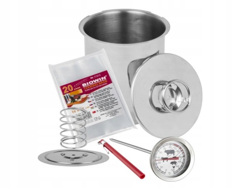 Виріб виготовлено з високоякісної нержавіючої сталі. Шинковарка має всі види сертифікатів для контакту з харчовими продуктами. Ідеально підходить для домашнього виробництва шинки, фаршу, гомілки, бекону та рулетів. Продукт дозволяє приготувати до 1,5 кг м'ясної продукції за раз. Кришка має гніздо з отвором, що дозволяє безпосередньо вставити термометр і перевірити температуру м'яса. У набір входить термометр для прямого контролю температури м'яса та пакети, завдяки яким ми зможемо готувати холодець. Шинковарку можна легко мити під теплою водою з милом або в посудомийній машині без будь-яких турбот.