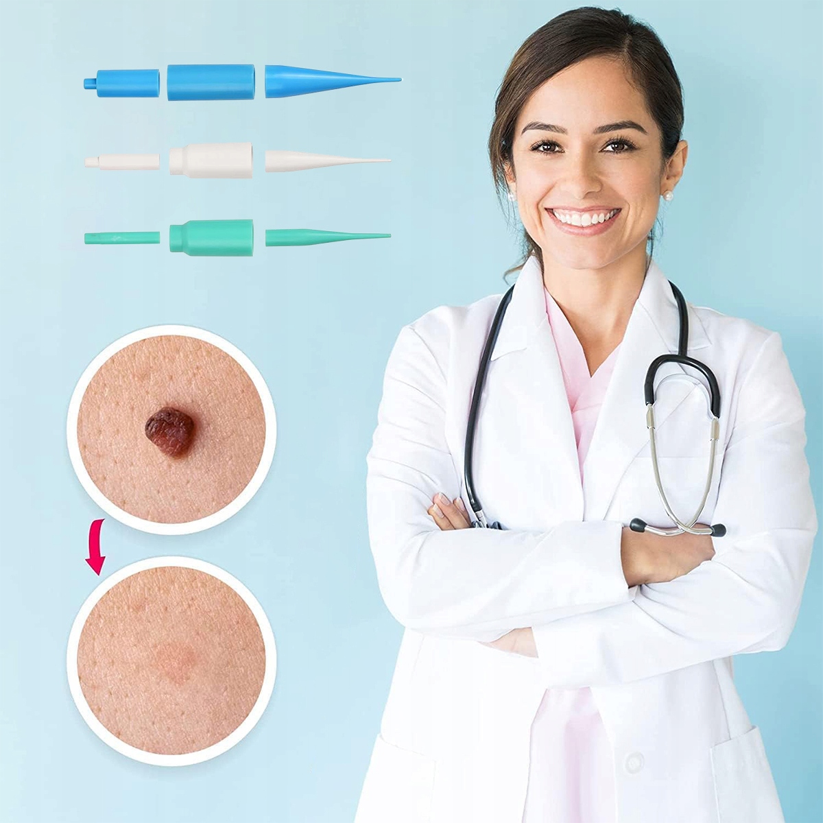 - ⏺Простота у використанні: пристроєм можна керувати однією рукою, що полегшує доступ важкодоступні шкірні утворення. Наш набір для видалення шкірних плям включає пристрої стандартного та мікророзміру для видалення малих і великих шкірних плям (1-8 мм).