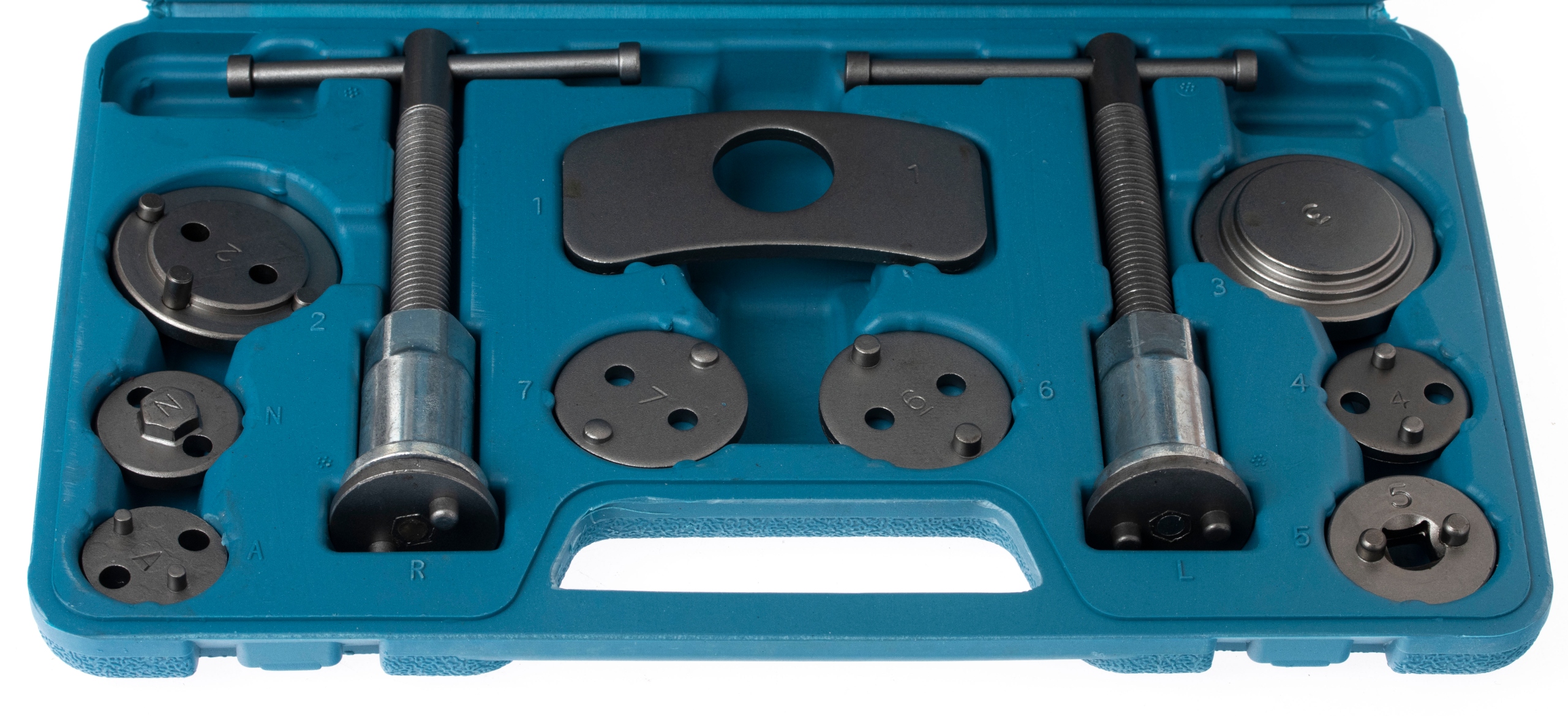 Набір включає два преси (правий і лівий поворотний), дві різні за формою балки для притискання преса до сідла супорта та 17 адаптерів, адаптованих до розміру гальма поршні, які використовуються в більшості легкових автомобілів, що випускаються на європейському та азіатському ринках. Набір виготовлений зі сталі найвищої якості, упакований у міцний пластиковий футляр, ударостійкий і дуже зручний для носіння. Ручка оснащена магнітним наконечником, який утримує кожен адаптер. Ідеально підходить для роботи з керамічними поршнями.