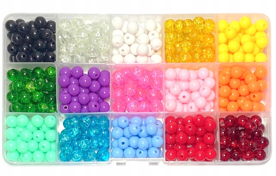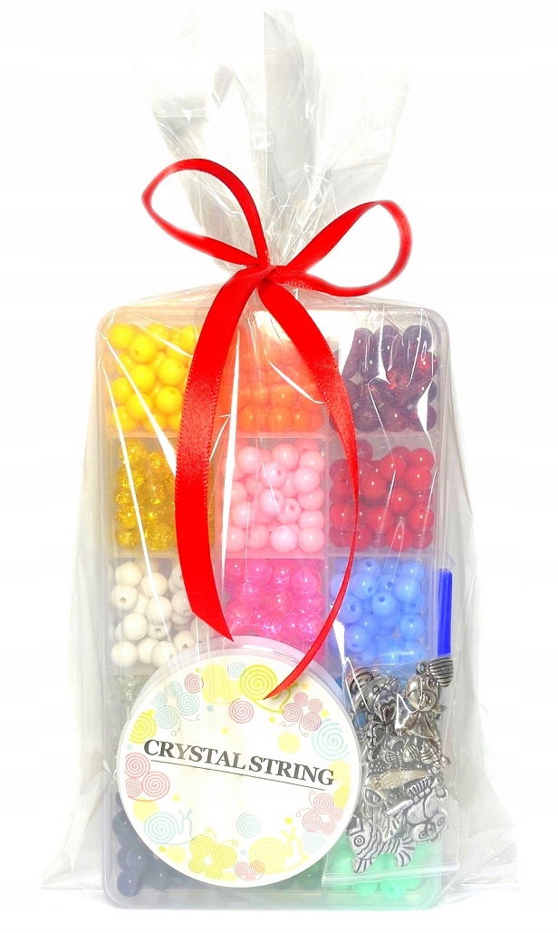До набору входить органайзер, наповнений різнокольоровими намистинами, котушка з еластичної гуми, декоративні підвіски та монтажні кільця