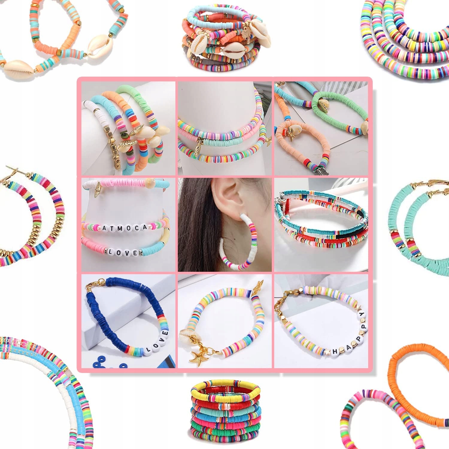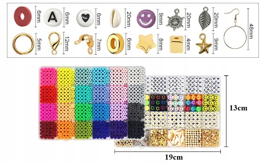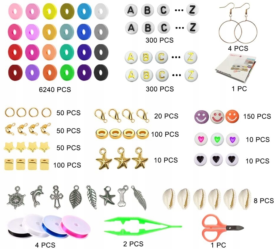 ⭐Набір містить 2 коробки з 7300 різнокольоровими намистинами, амулети (намистини-листочки, смайлики, розпірки, літери (повний алфавіт – звичайні та позолочені літери), амулети, застібка з омарами тощо, 4 рулони еластичних ниток, ножиці, 1 пінцет.
