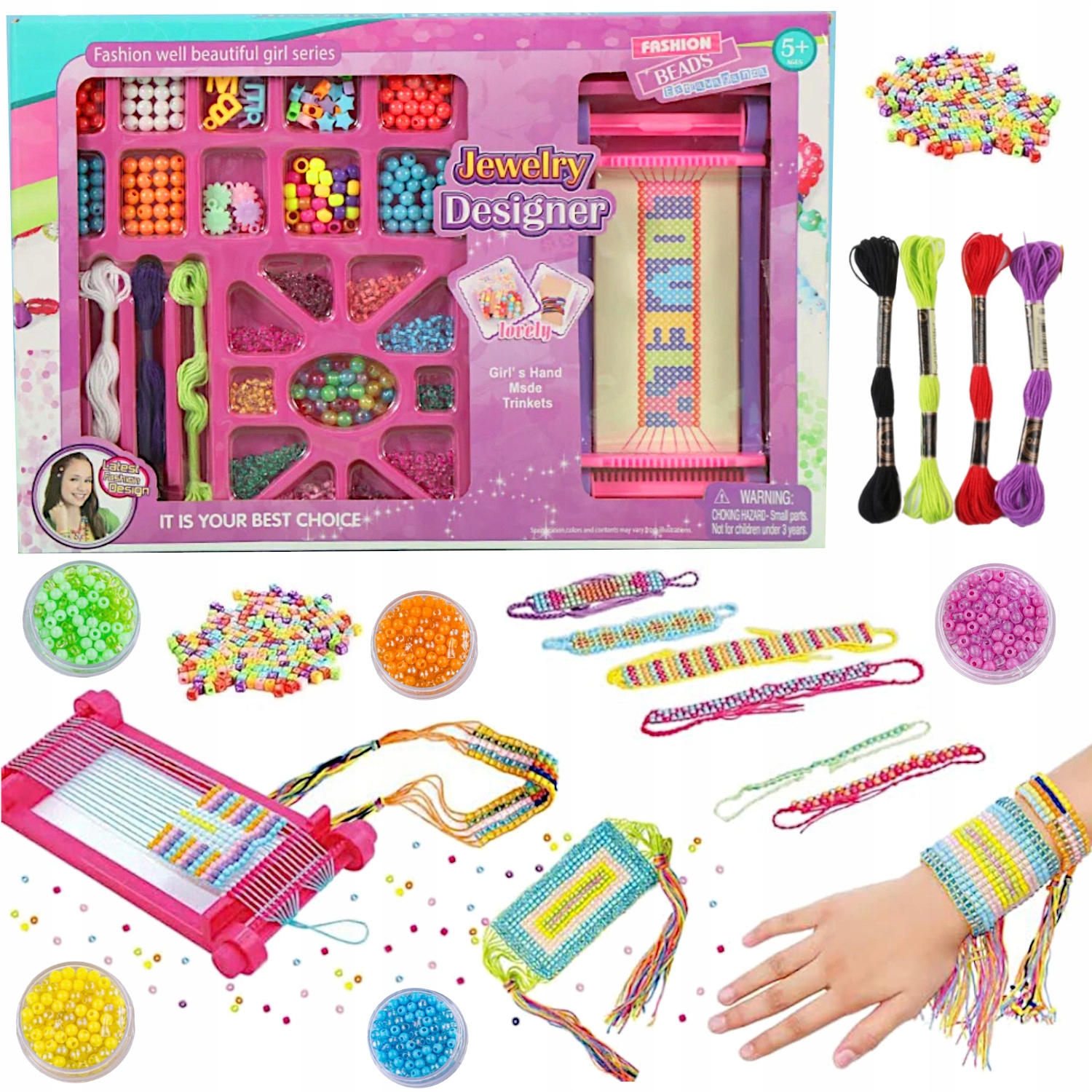 Набір включає потоки, що складають основу браслета, а також багато різноколених намистин і ткацьких верстатів, що полегшує творчий процес.