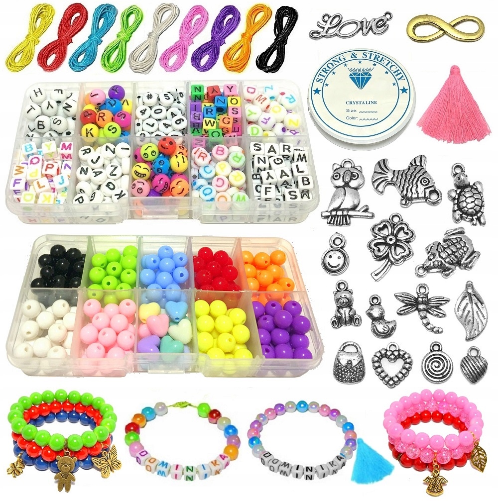 У набір входять різнокольорові шнурки та еластична стрічка для пронизування бісеру