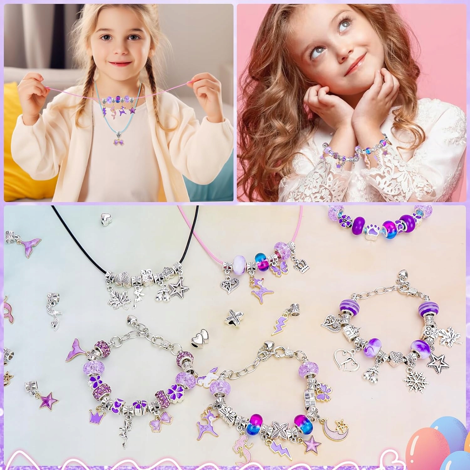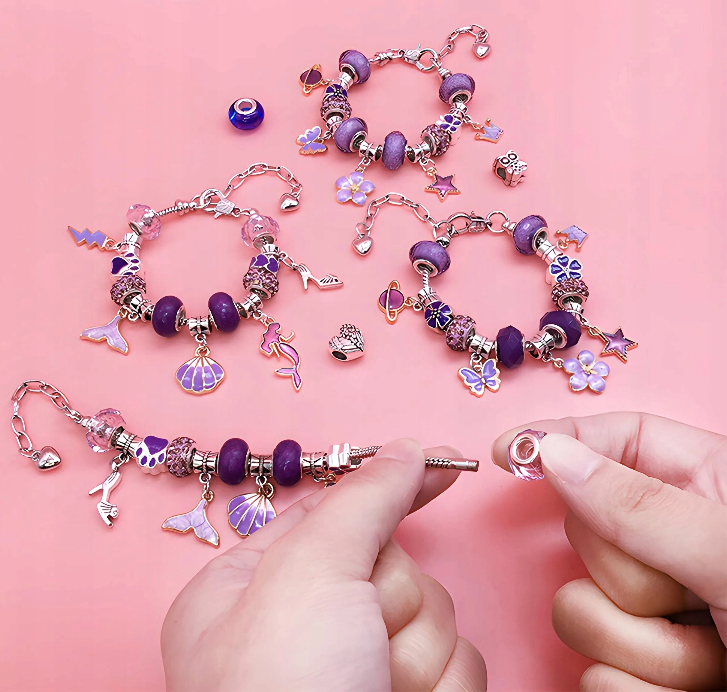Підвіски та намистини: понад 60 різних підвісок і намистин, включаючи такі мотиви, як серця, корони, квіти, метелики, бантики, єдинороги, сови, зірки та багато інших.