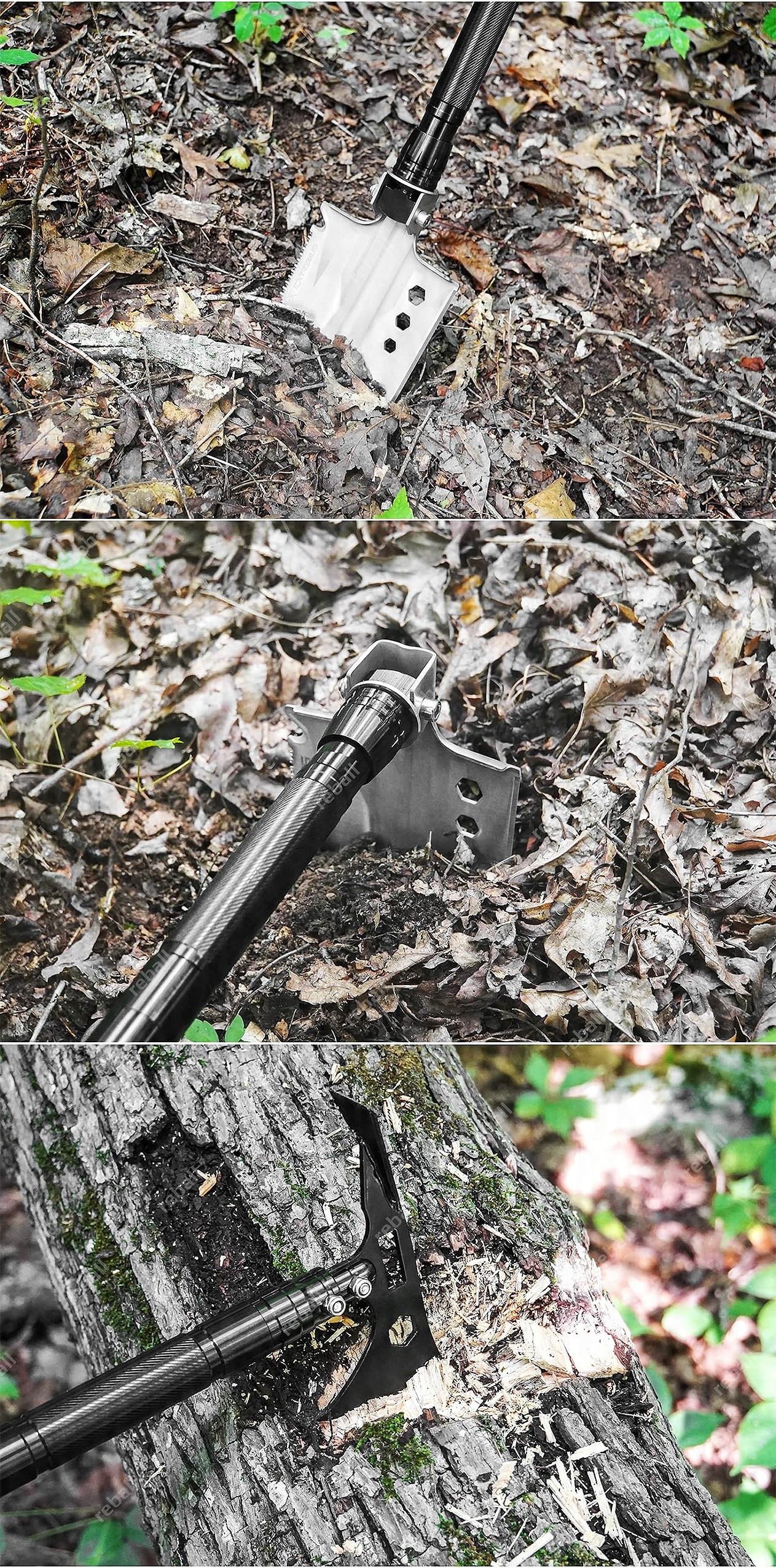 Корпус лопати виготовлений з нержавіючої сталіз винятковою міцністю, що гарантує надійність навіть у найскладніших умовах. Алюмінієва ручка поєднує в собі легкість і довговічність, а ергономічна рукоятка з трьох скручених труб забезпечує комфорт і надійний хват під час використання. Після розкладання лопати лопата фіксується міцним штифтом, що забезпечує стійкість під час роботи.