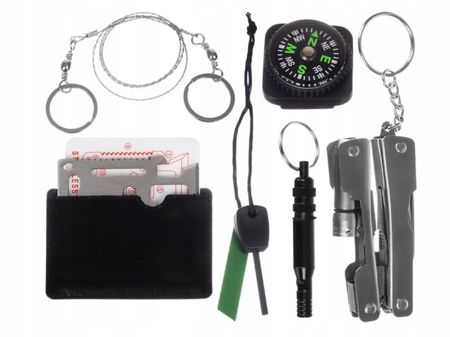 7в1- в набір входить карта виживання 11в1, компас, мультитул, мотузкова пила довжиною 70 см, розпалювач із жезлом на мотузці, герметичний контейнер зі свистком, в якому можна приховати щось дрібне, і наклейку з попередженнями.