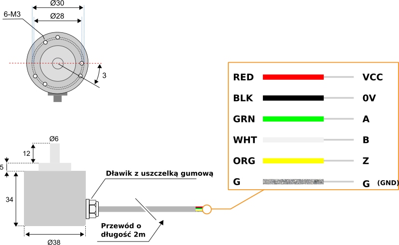 Імпульсний інкрементний кодер на 360 обертів. 5–26 В постійного струму, тип виходу Push-Pull, сигнал ABZ, усічений вал 6 мм.