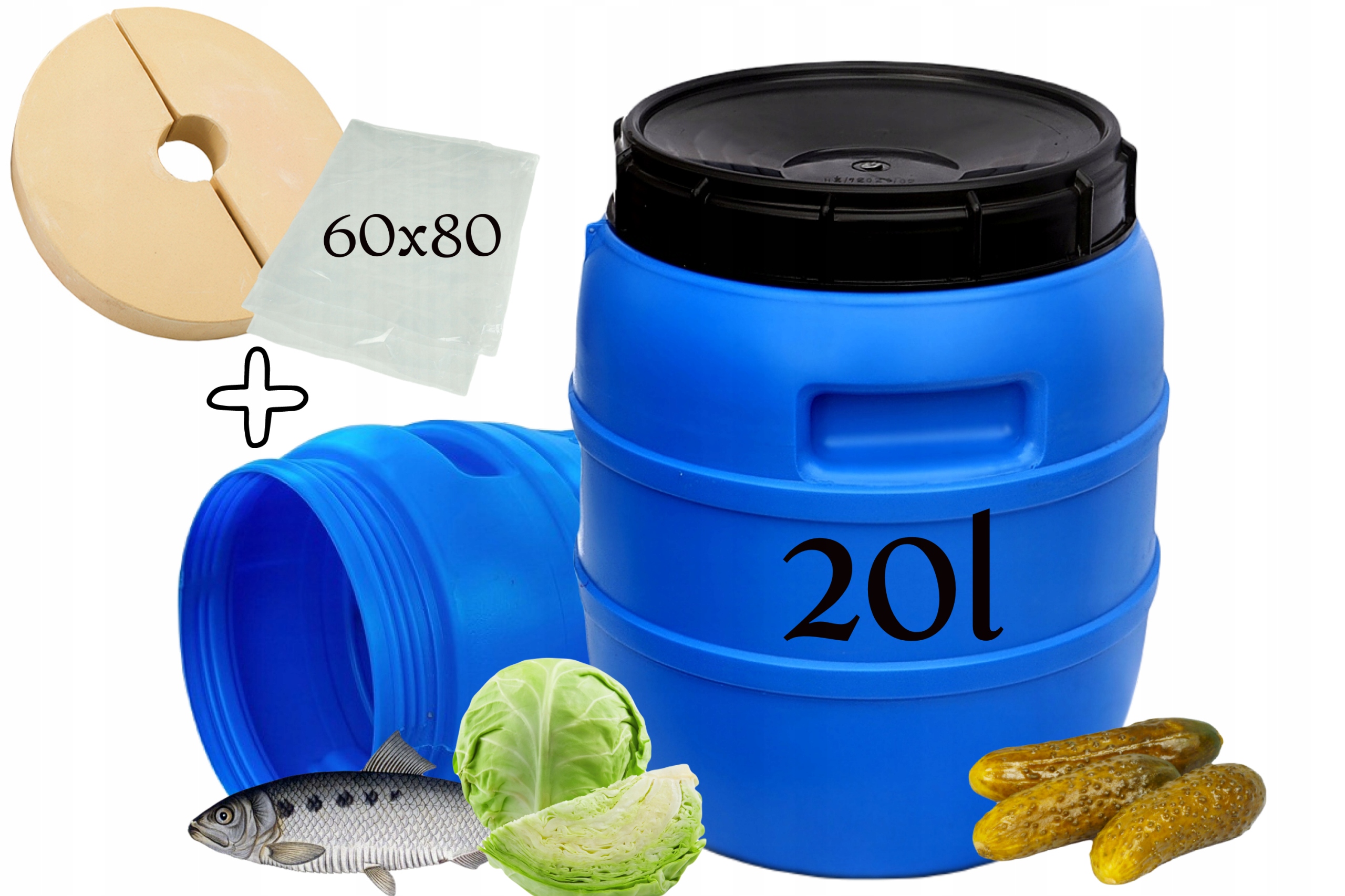 НАБІР ДЛЯ СЕРІБЛЕННЯ КАПУСТІ, ПЛАСТИКОВА БОЧКА З КРИПКОЮ ТА РУЧКАМИ, 20 ЛІТРІВ + МІШОК ДЛЯ СЕРІБЛЕННЯ КАПУСТІ + ТІКОВИЙ КАМІНЬ