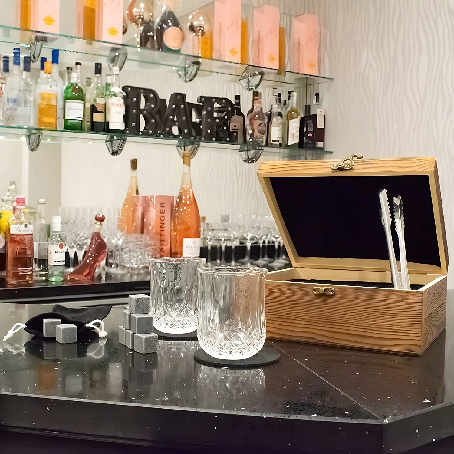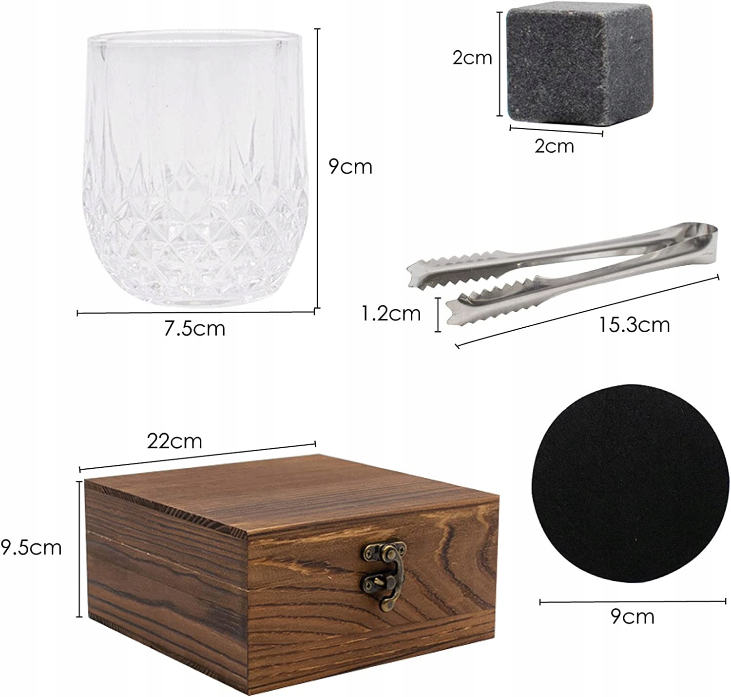 Набір для віскі містить усе необхідне для створення ідеальних умов для дегустації. У набір входять вісім каменів для віскі з натурального граніту, які можна охолодити в морозильній камері, а потім помістити в келих для підтримки ідеальної температури віскі. У набір також входять дві елегантні склянки, ідеально підібрані до каменів для віскі, і дві підставки, на які можна поставити склянки, щоб запобігти пошкодженню столу.