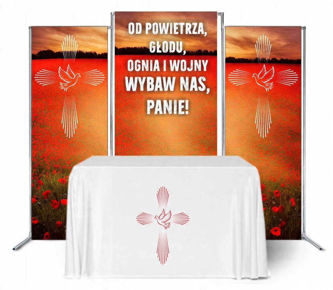 Повний комплект вівтаря для Корпус-Крісті, який включає банери, раму та скатертину.
