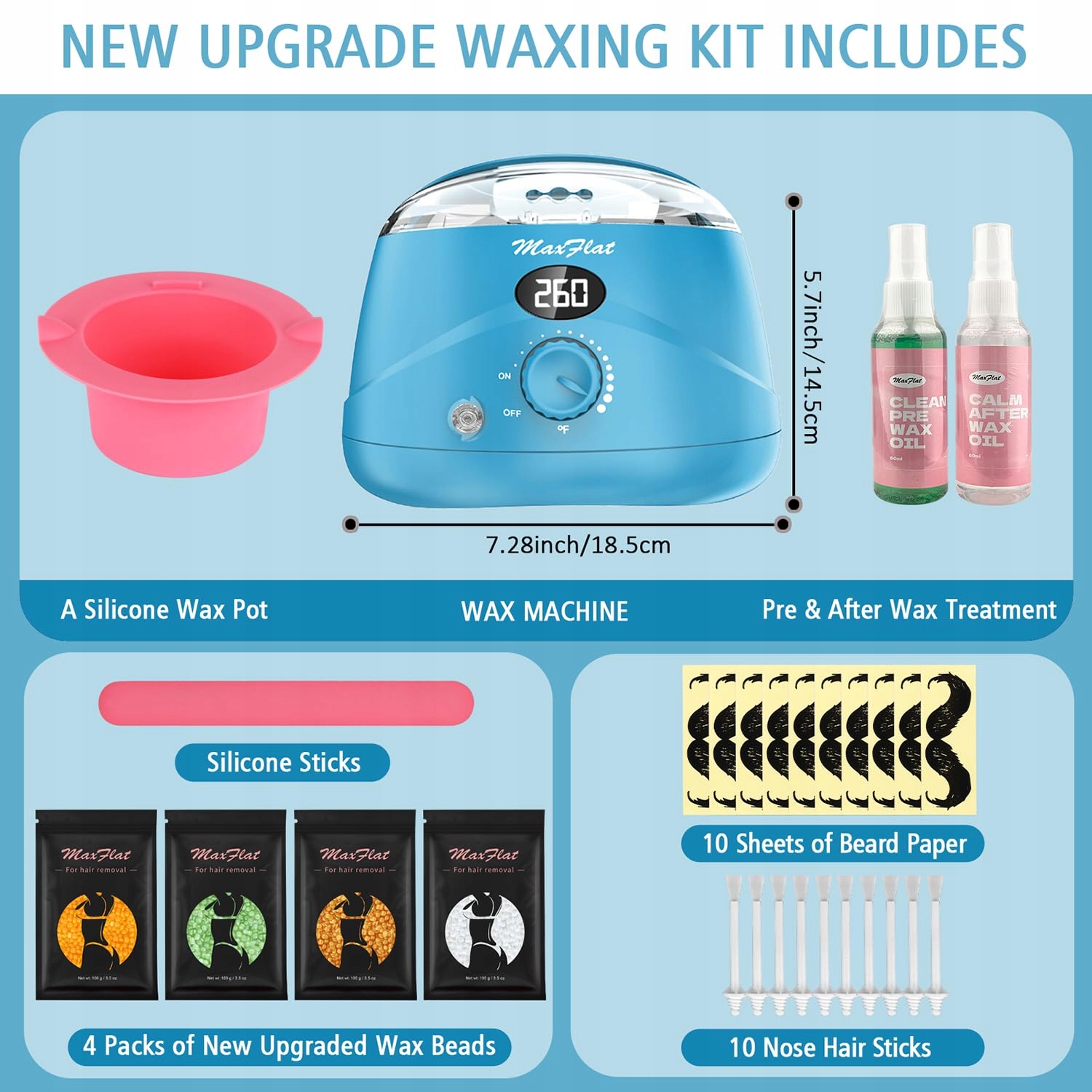 ???? , щоб ви могли воском, щоб ви могли воскити, щоб ви могли воскити, коли захочете. Наприклад, ви встановлюєте температуру на 185 ℉, і як тільки температура падає, вона знову нагрівається, і індикатор змінює колір від зеленого на червоний. Це ідеальна депіляція для чоловіків і чоловіків! "???? Легше чистити. ✨【 Цифровий набір воску】 Цей нещодавно вдосконалений набір воску має не тільки унікальний вигляд, але й функцію цифрового дисплея, яка корисна для перевірки температури бразильського воску в наборі воску в будь -який час, щоб переконатися, що температура правильна. (Рекомендується перевірити невеликий шматок розтопленого воску на плечі перед тим, як використовувати, щоб переконатися, що він не надто гарячий). ???? 10 великих, 10 маленьких), 1 пляшка підготовки перед воскуванням, 1 пляшка підготовки після воску, 10 паличок для носа, 10 аркушів бороди та 1 посібник користувача.