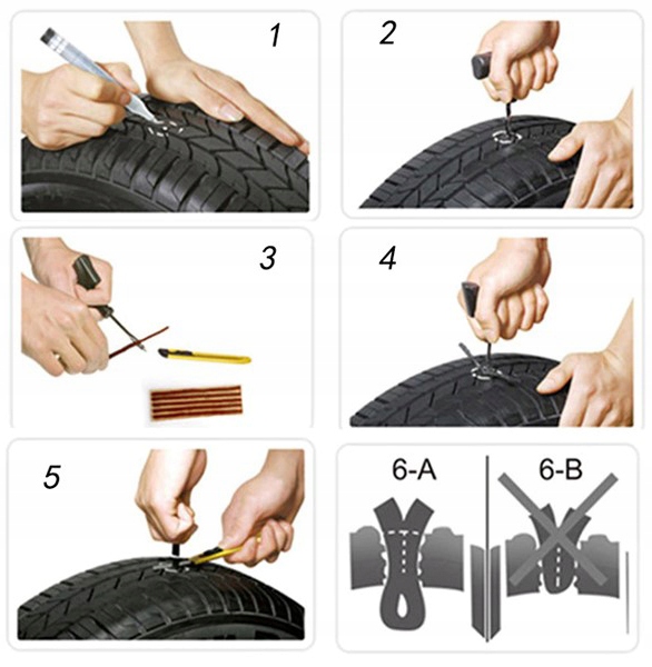 Набір не підходить для розрізаних шин або бічних проколів, тільки в місцях, де є протектор.