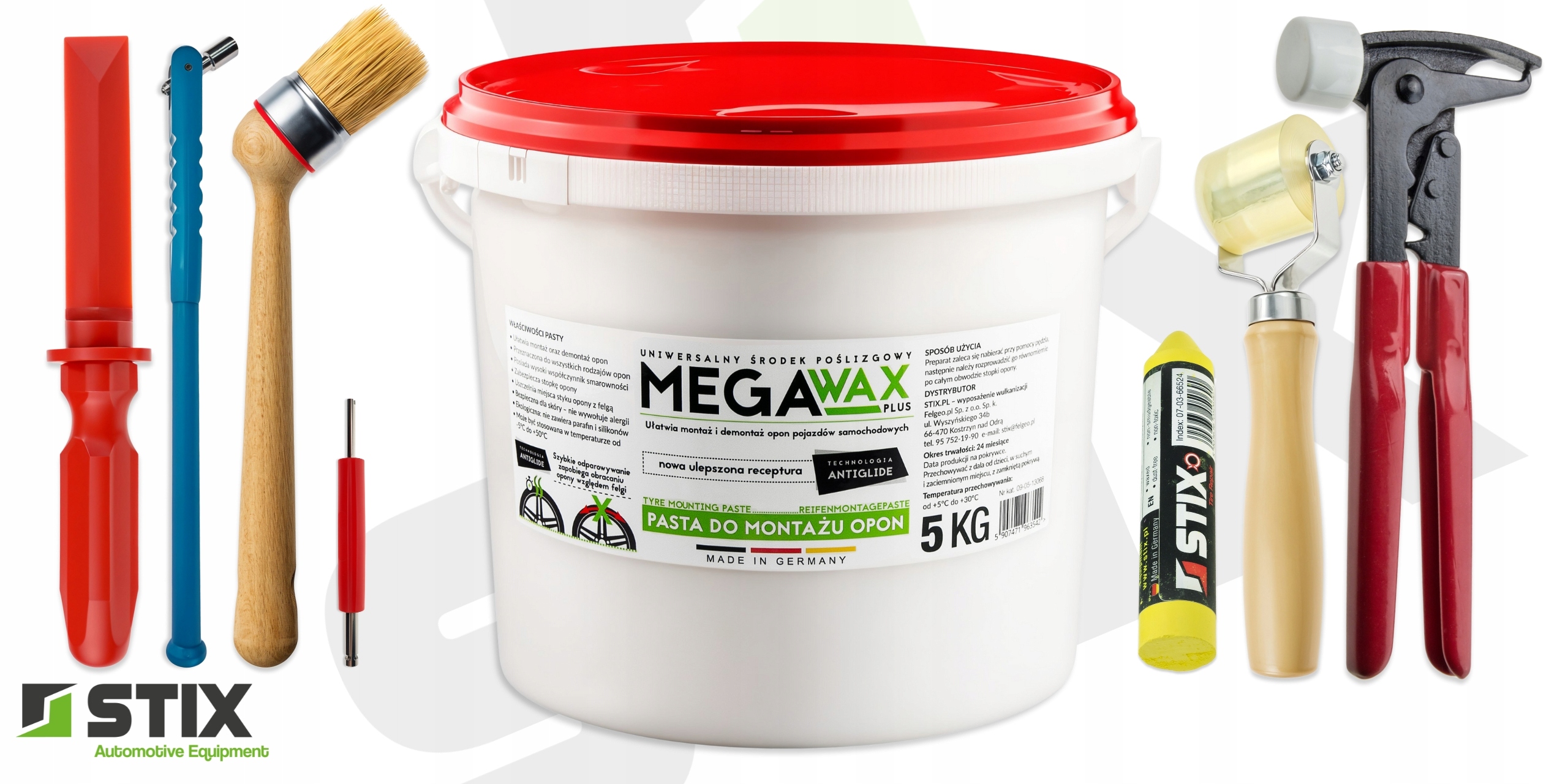 - Паста монтажна MEGA WAX Plus 5 кг | 1 шт. – універсальне мастило для всіх типів шин, збагачене технологією ANTIGLIDE. Полегшує встановлення та зняття шин, захищає борт і запобігає ковзанню по ободу.