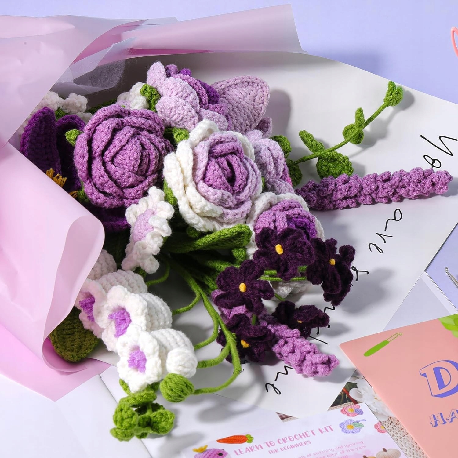 Набір для в'язання гачком для початківців - зробити букет квітів за допомогою пряжі та покрокові відеоуроки, ювілей, подарунок, прикраса для дому, найкращий подарунок (фіолетовий)