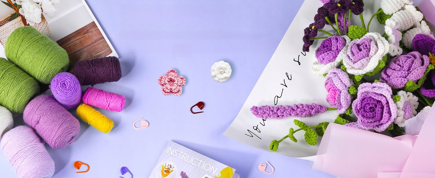 🧶Набір для в’язання гачком містить основні інструкції з в’язання гачком, які допоможуть вам краще зрозуміти принципи в’язання гачком. Ви можете легко скористатися підручниками та відеопосібниками, щоб навчитися в’язати гачком і створювати букети квітів фіолетових троянд, кожен крок має детальний опис. пояснення.