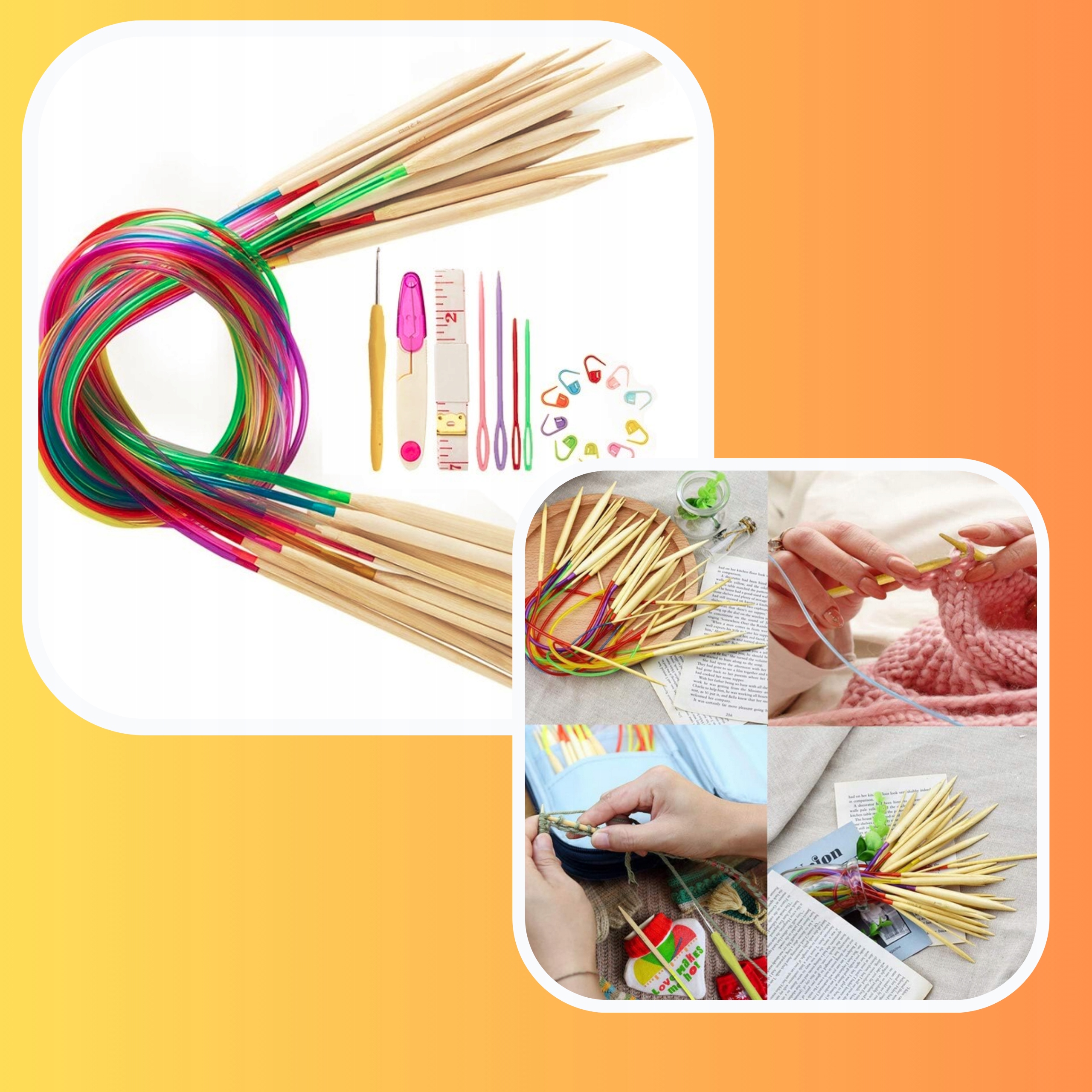 Цей повний набір, який ідеально підходить для любителів рукоділля, включає 18 різних розмірів кругових спиць із високоякісної бамбукової деревини, що забезпечує довговічність і зручність використання. Дроти легкі, гладкі і теплі на дотик, що мінімізує втому рук і дозволяє довгі години приємної роботи. Лінія є гнучкою та довговічною, що дозволяє легко зберігати ваші проекти в’язання.