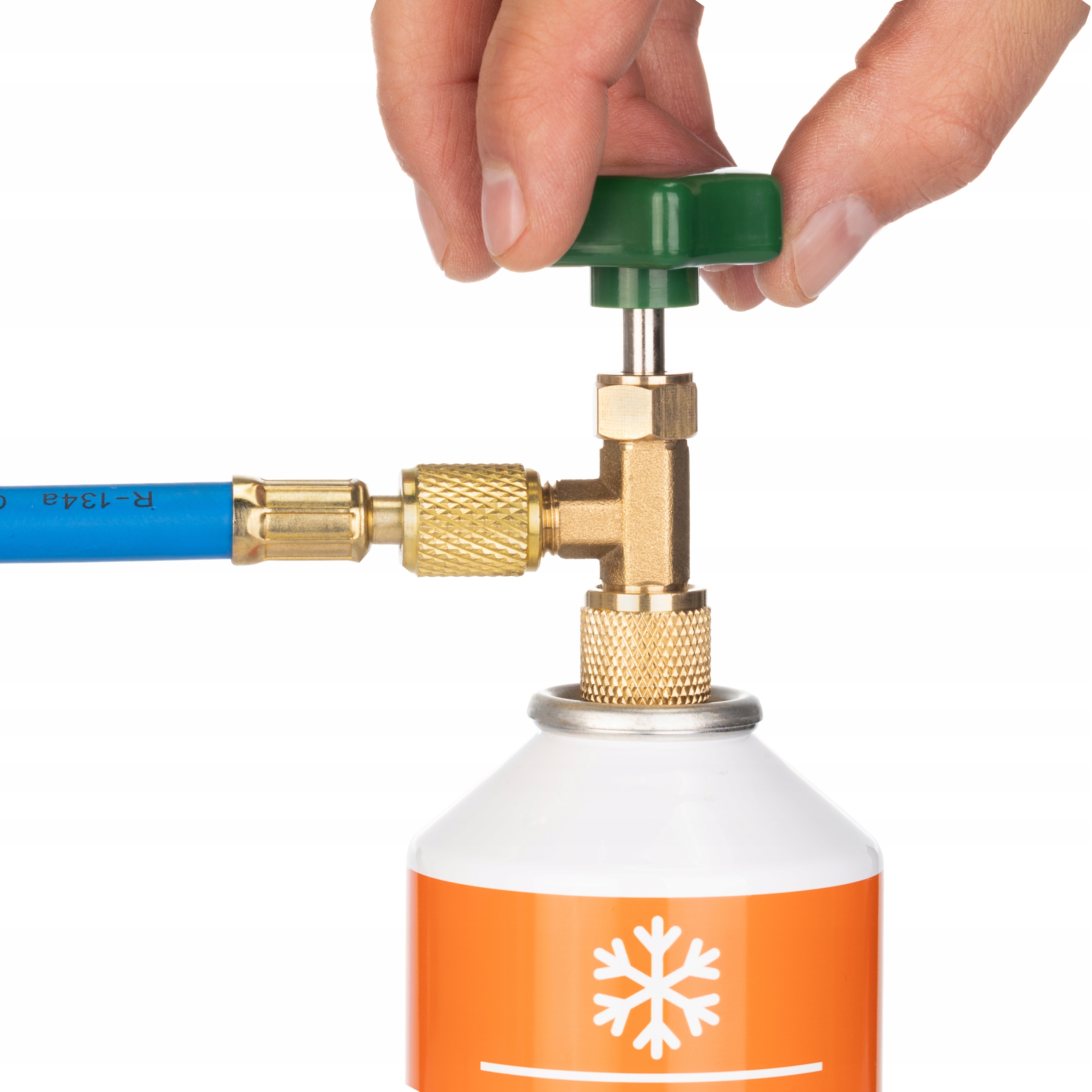 8. Повільно затягніть ручку вентиля, тримаючи балон догори дном - це необхідно для того, щоб середовище потрапило в систему у вигляді рідини, і при цьому перевірте тиск на манометрі.