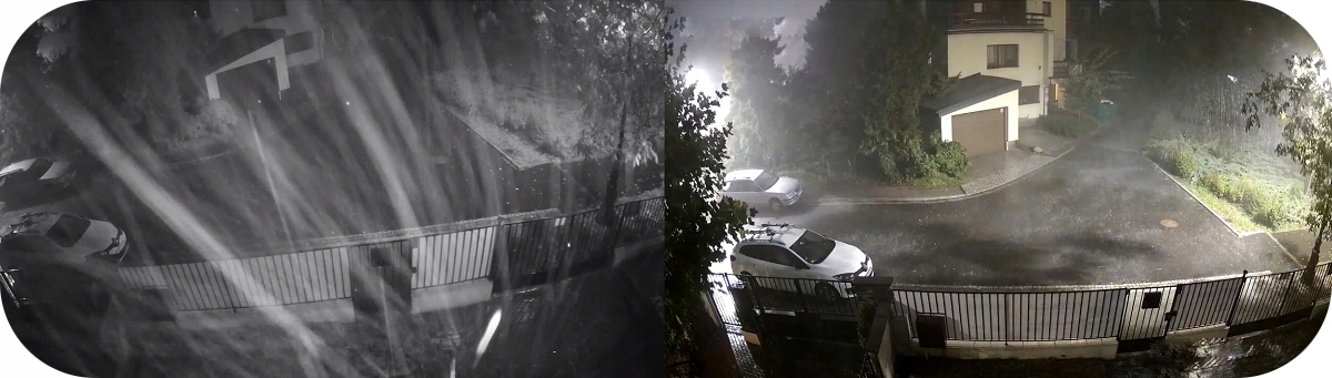 Фото ліворуч - камера з ІЧ-освітлювачем, фото праворуч - камера працює в інноваційному СВІТЛОДІОД-ПОВНОКОЛЬОРОВИЙ