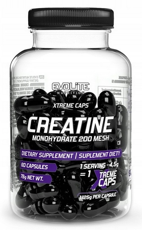 Evolite Creatine Xtremeце дієтична добавка, яка містить креатин моногідрат найвищої якості у формі капсул. Evolite Creatine Xtremeне містить жодних наповнювачів у вигляді підсолоджувачів або штучних барвників. Одна порція продукту забезпечує рівно4,5 г креатину (4 капсули).