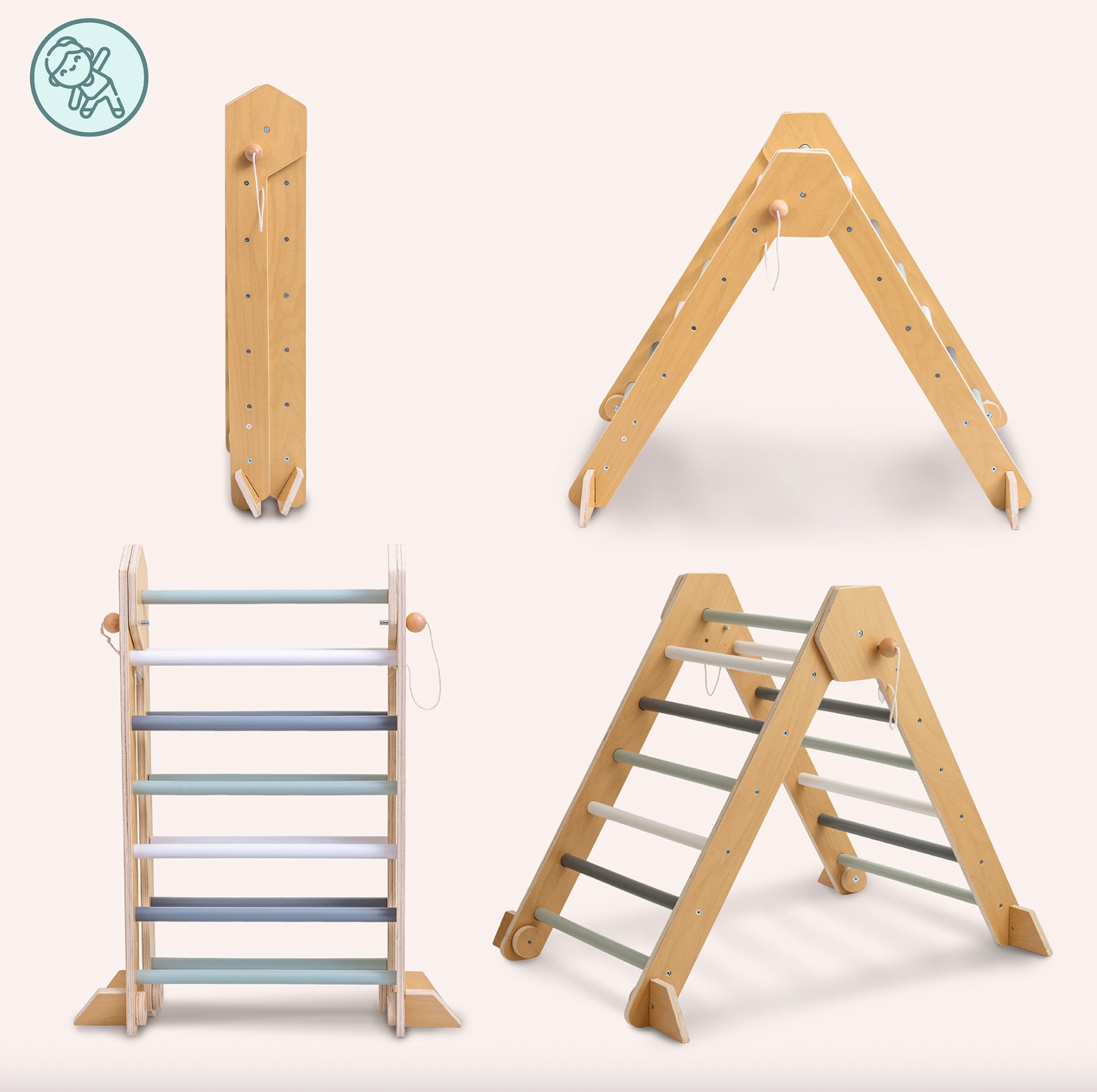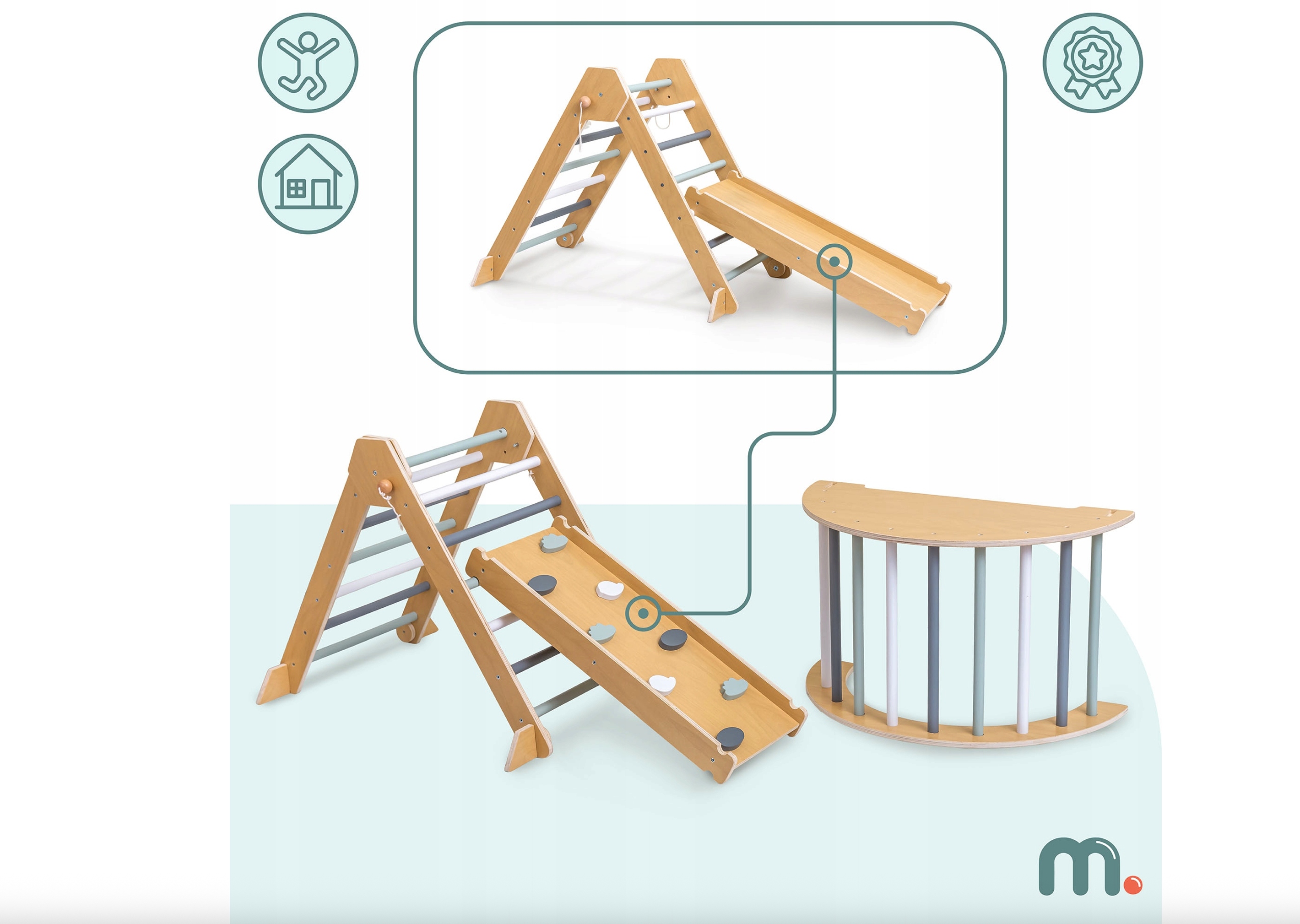 Дерев'яний набір Mamabrum 4in1 поєднує в собі трикутник Піклера, коромисло/дугу для скелелазіння та двосторонню рампу - гірку з одного боку та стінку для скелелазіння з іншого.