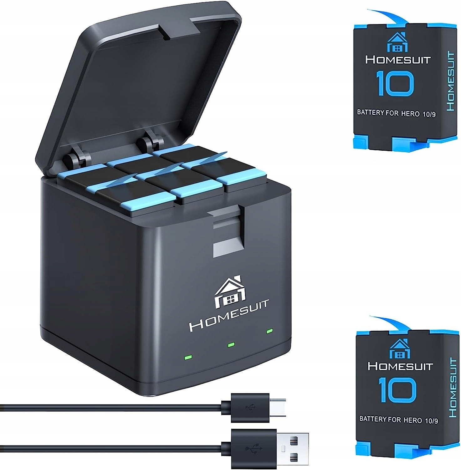 USB зарядний пристрій для швидкої зарядки: Зарядний пристрій Homesuit Hero 9 оснащений роз'ємом Type-C, що дозволяє швидко заряджати його. Червоне світло означає зарядку, зелене світло означає повну зарядку. Він може заряджати 3 батареї одночасно і незалежно. Забезпечує швидку зарядку, переконайтеся, що вхідне живлення відповідає 5 В 2,1 А.