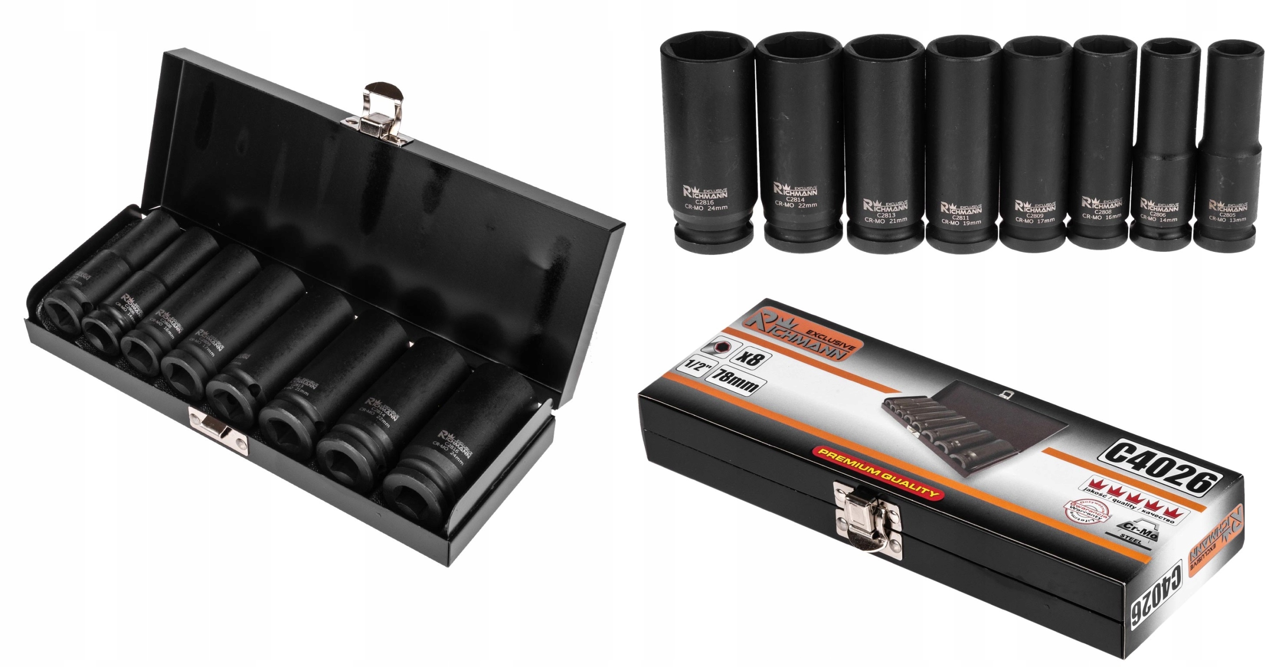 Набір довгих ударних головок діаметром ½ дюйма в діапазоні розмірів 13–24 мм забезпечує користувачам універсальність і точність під час роботи. Це ідеальний інструмент для механіків, сантехніків і ентузіастів домашніх робіт, які цінують якість і надійність. Висока якість і довічна гарантія є гарантією задоволення для кожного користувача.