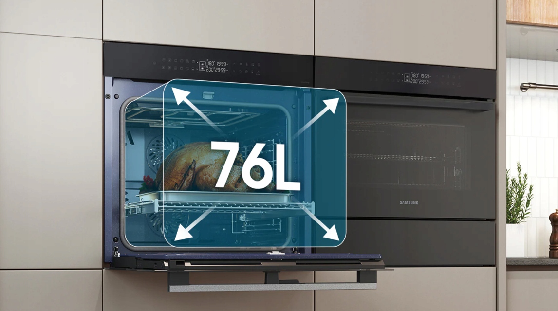 Ємність до 76 л полегшує приготування великих або більших страв. Це відкриває нові можливості при приготуванні їжі. Готуючи вечірку, ви можете легко приготувати різні страви одночасно. Духовка легко вміщає навіть великі страви, наприклад, велику індичку, заплановану на сімейну зустріч.