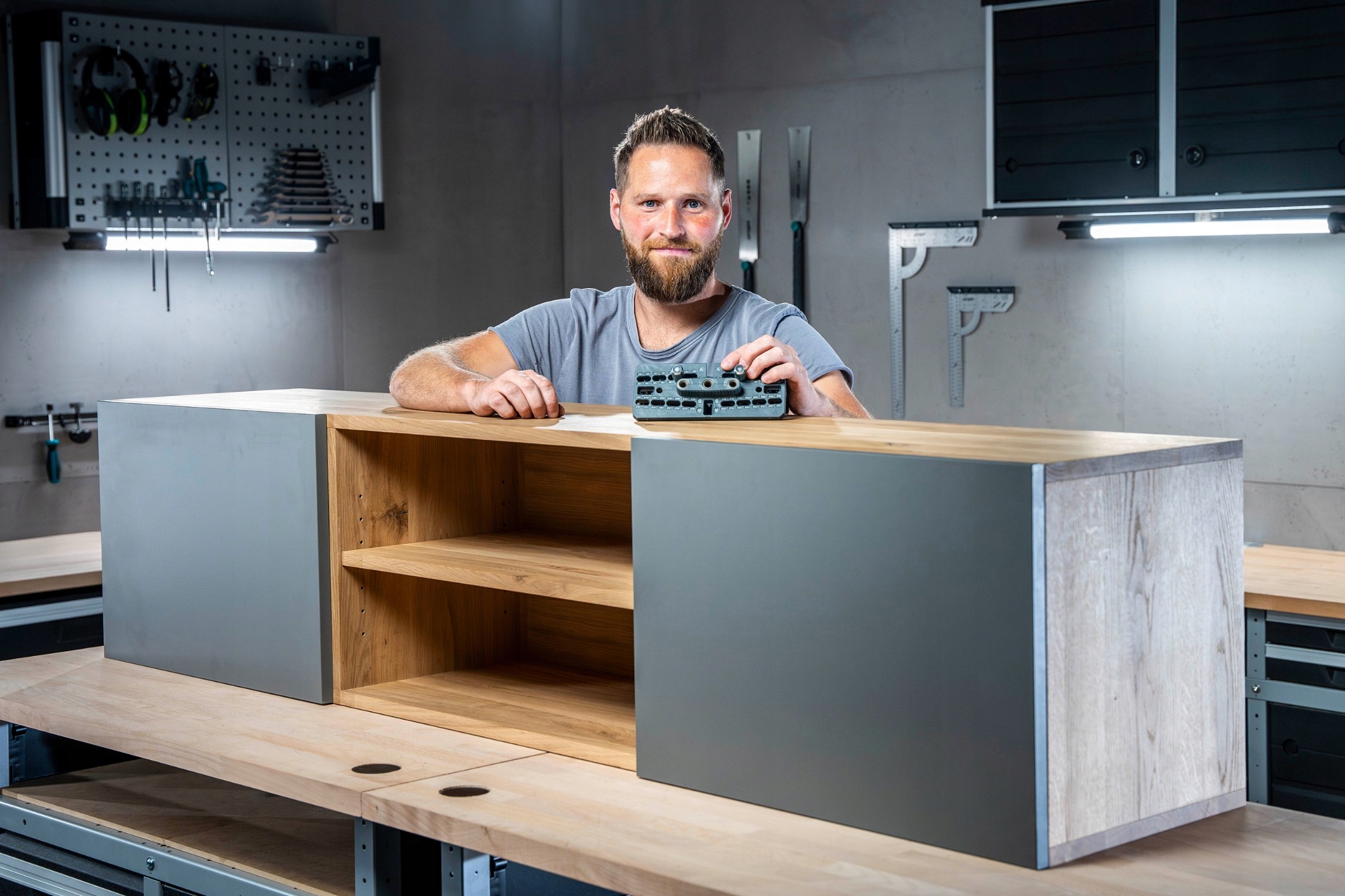 Шаблон для свердління, що складається з двох частин, використовується для визначення правильних позицій отворів і глибини свердління, які потім просвердлюються в з’єднаних елементах меблів за допомогою свердел, обладнаних обмежувачами глибини.