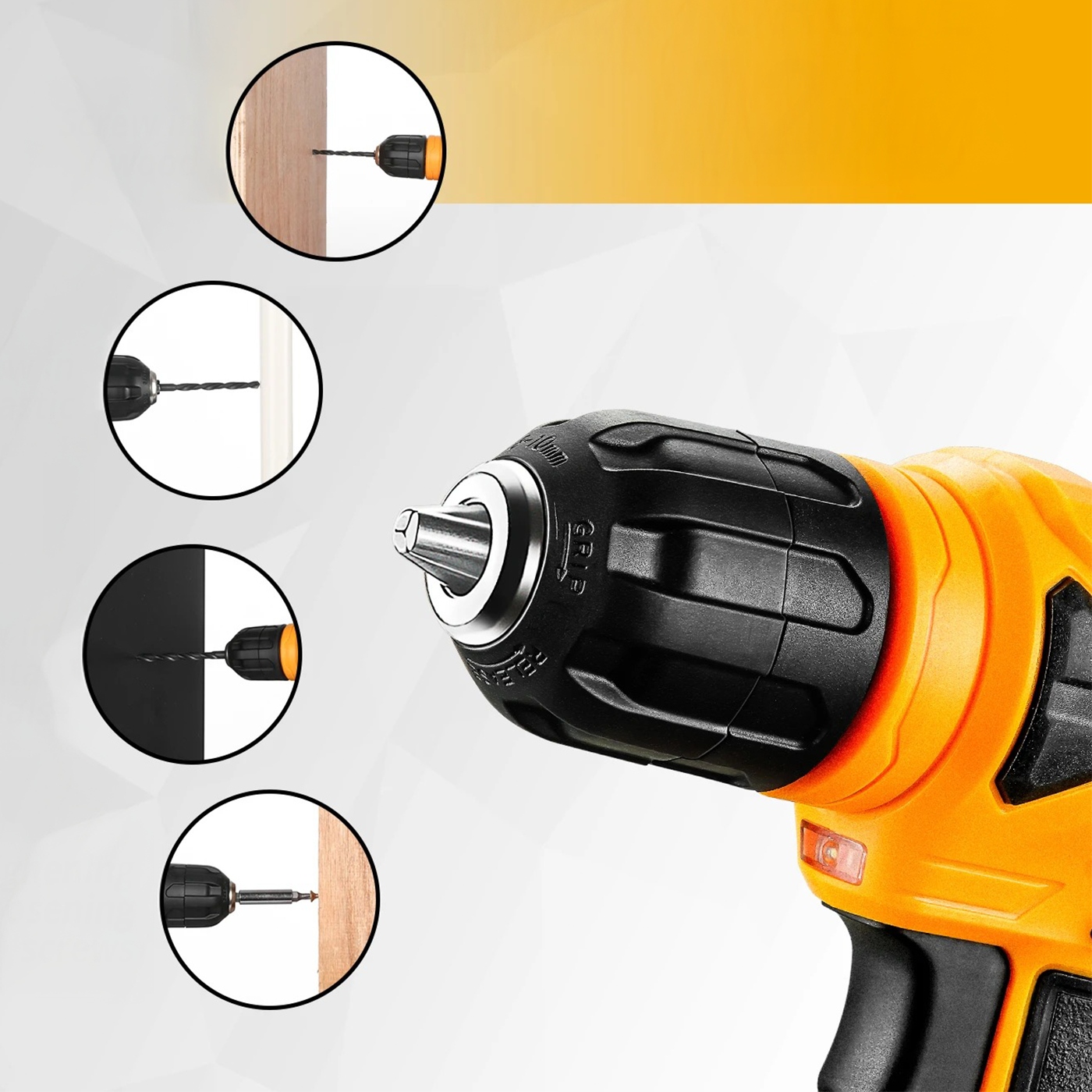 - Неспрямований патрон: Оснащений швидкоключовим патроном 10 мм (3/8 дюйма) для швидкої заміни аксесуарів.