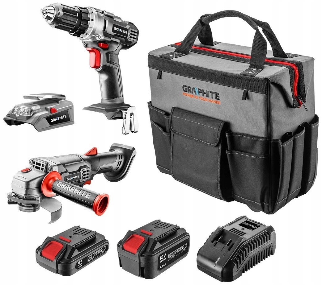Багатий набір електроінструментів марки Graphite стане в нагоді в будь-якій майстерні. Акумуляторна дриль-шуруповерт має швидкість 0-350/хв та 0-1250/хв, обертання вправо/вліво, самозажимний патрон 0,8 – 10 мм, положення кільця зчеплення 1 – 19 (і можливість свердління), крутний момент (м’який/жорсткий): 28 b> b>/44 Нм, гальмо шпинделя. Акумуляторна кутова шліфувальна машина 115 x 22,2 мм, швидкість 10000/хв, різьба шпинделя M14, двопозиційна бічна ручка . USB адаптер - LED ліхтарик потужністю 1 Вт, вбудований 1 LED діод, діапазон робочих температур 4 °C ÷ 40°C, зовнішні виходи USB 5V DC 1.5 A.