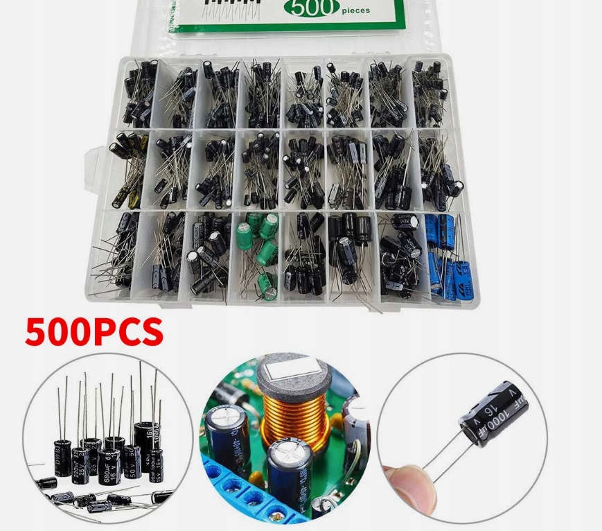 Набір конденсаторів електролітичні 500 шт. Набір містить 24 різних значення електролітичні конденсатори в діапазоні від 0,1 мкФ до 1000 мкФ. Вся справа там упаковані в пластиковий органайзер.