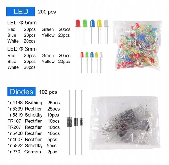 100 діодів, 8 різних типів, кожне значення має від 5 до 25 шт.