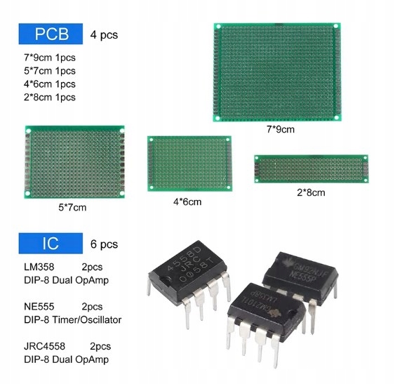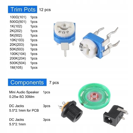 - Економте час із найбільш практичними та часто використовуваними електронними компонентами, 170 шт., електролітичними конденсаторами, 100 шт. 200 шт світлодіодів 310 шт DC-005, 2 шт., JRC4558, 2 шт., германієві потенціометри. 4 шт. друкованих плат.