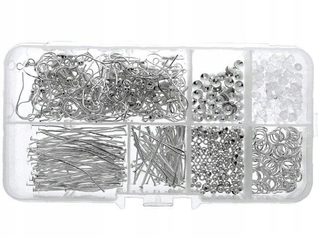 Тип елемента амбушури, ланки, кульки, накладки, шпильки, баранчики Колір - сріблястий Розмір - мікс Кількість - 600 шт. Все упаковано в практичний закритий органайзер.